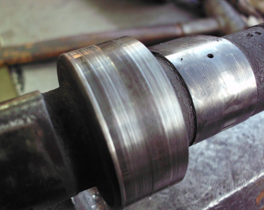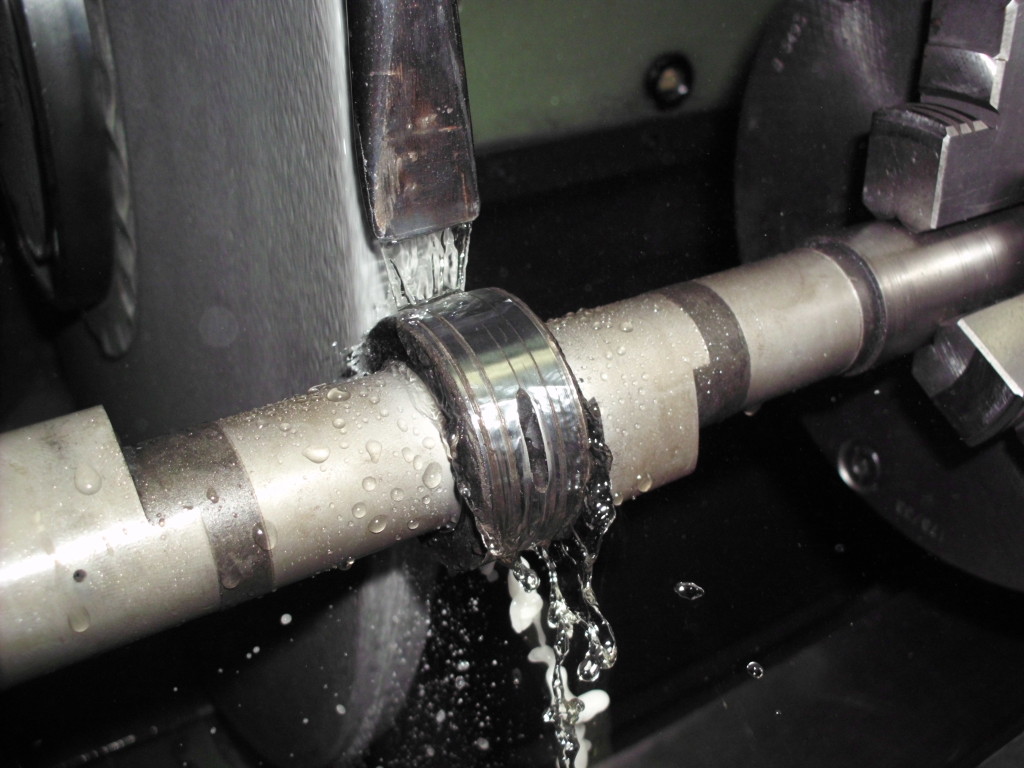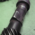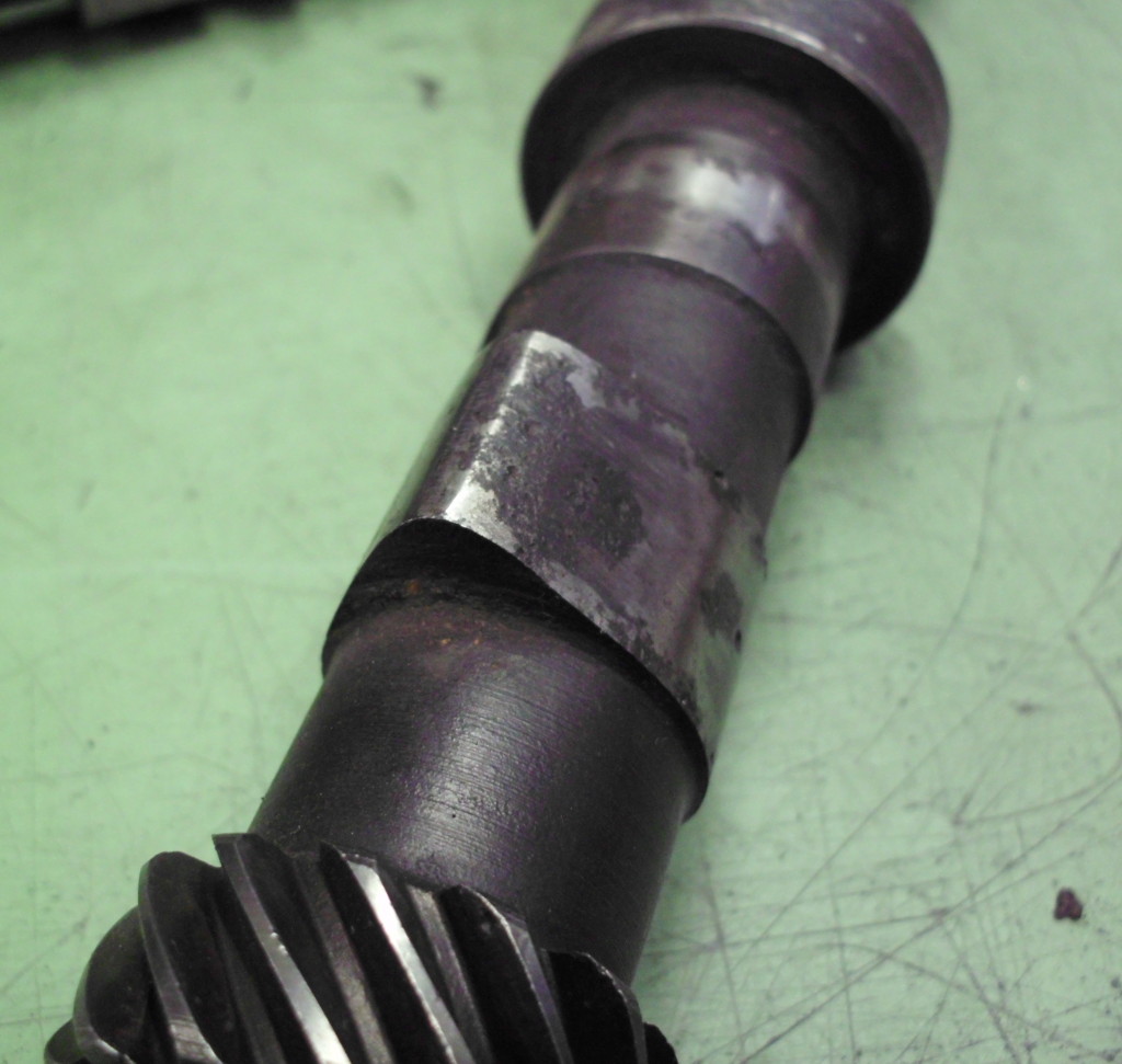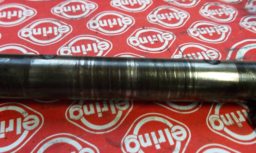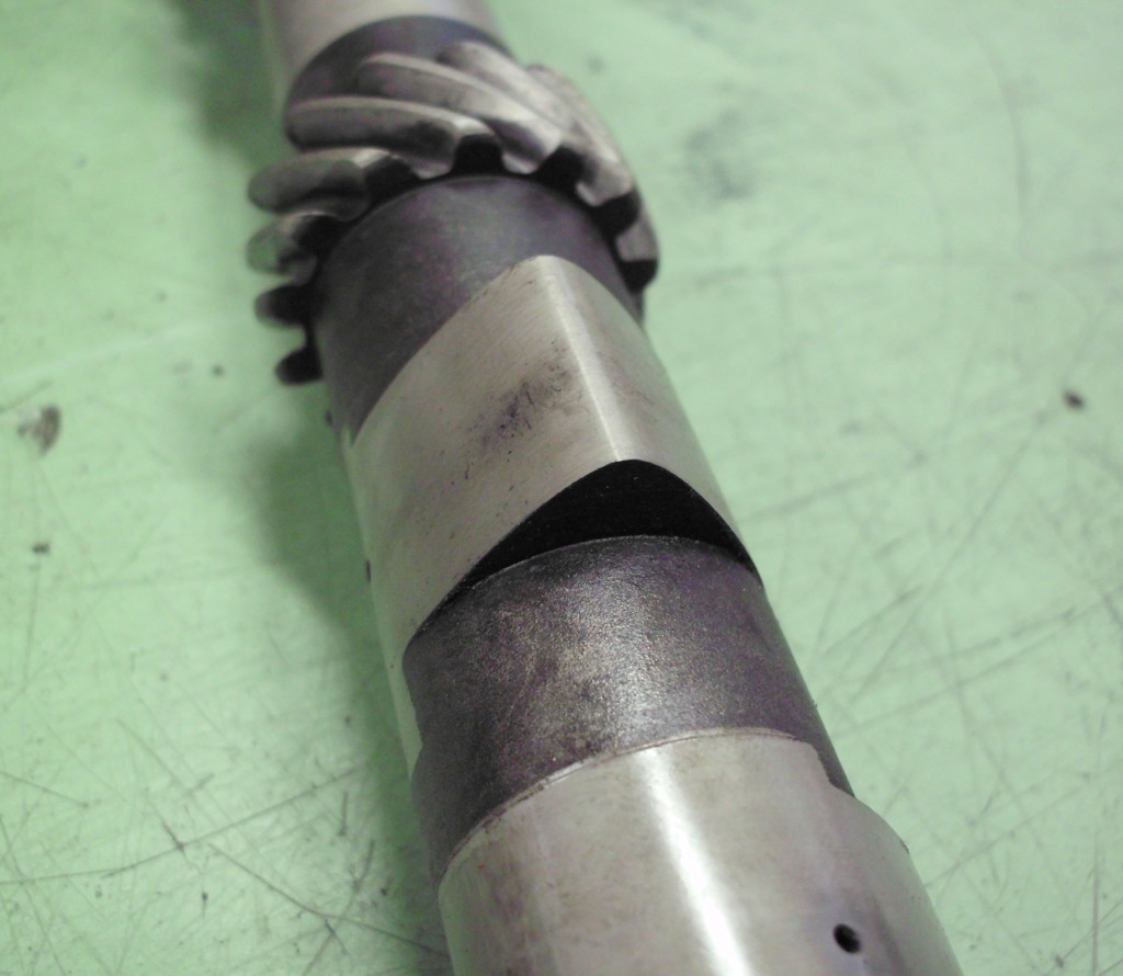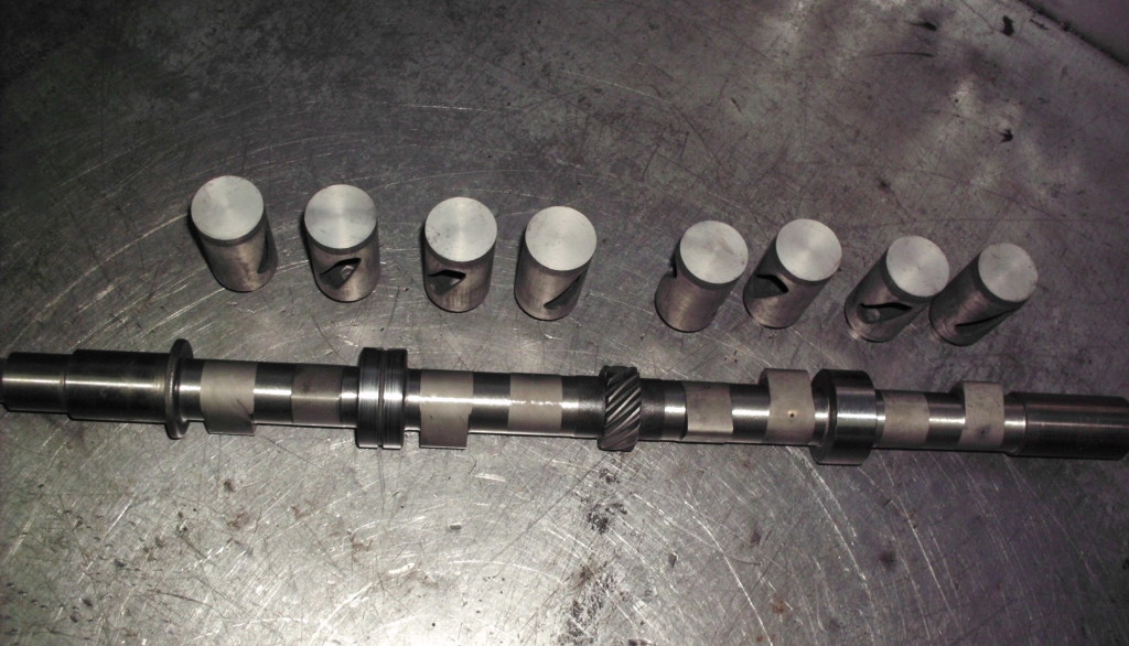 Die Nockenwelle zeigte sich im sehr desolatem Zustand. Eine Lagerstelle war stark beschädigt und die Nocken sahen ähnlich aus. Die beschädigte Lagerstelle auf der Nockenwelle wurde geschliffen. Für diese Lagerstelle wurde eine neue Lagerbüchse angefertig und in das Gehäuse eingezogen. Die Stößel wurden geschliffen und anschließend mit der Nockenwelle nitriert.