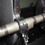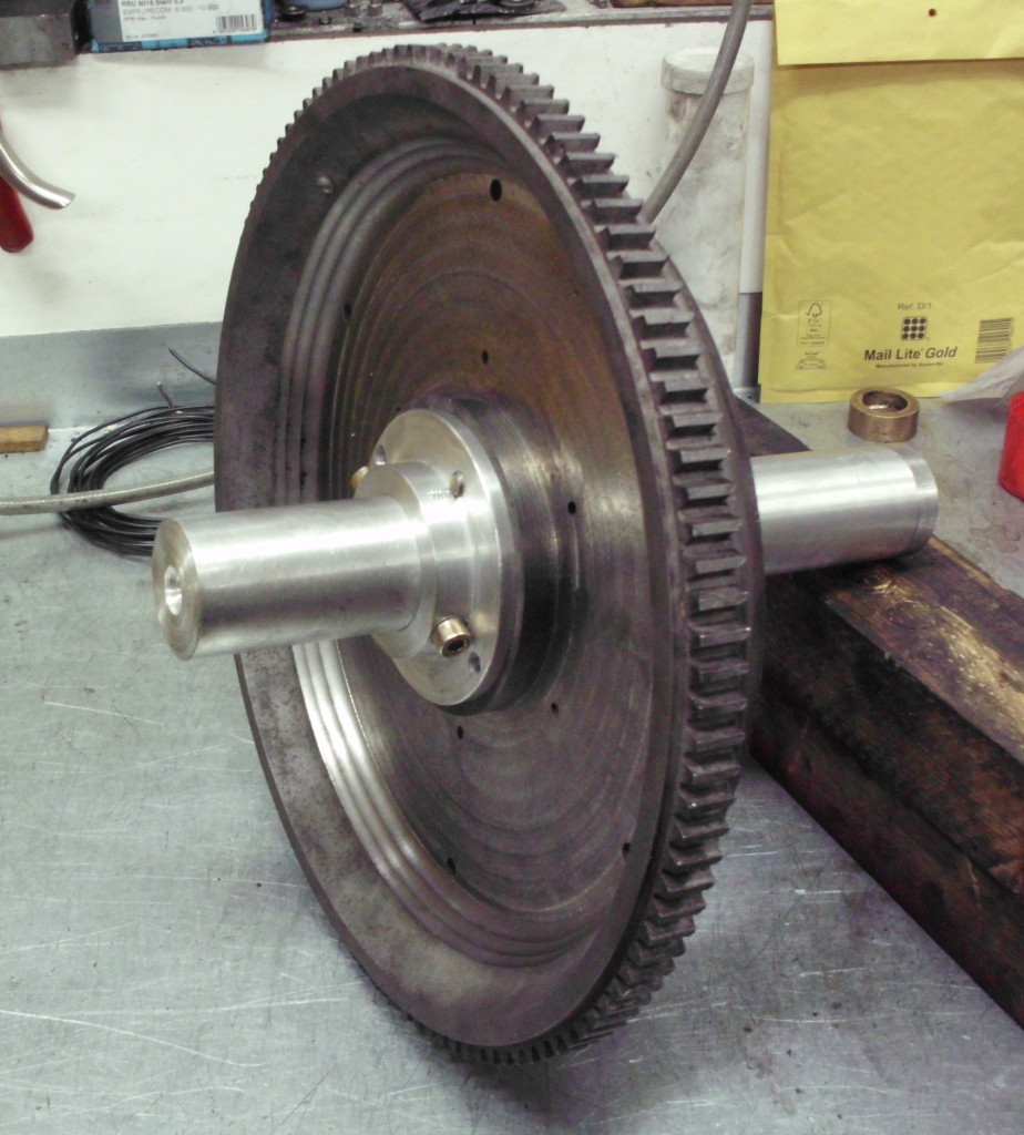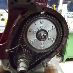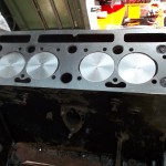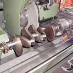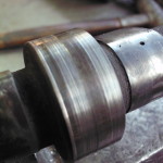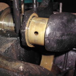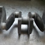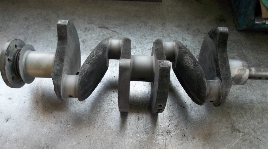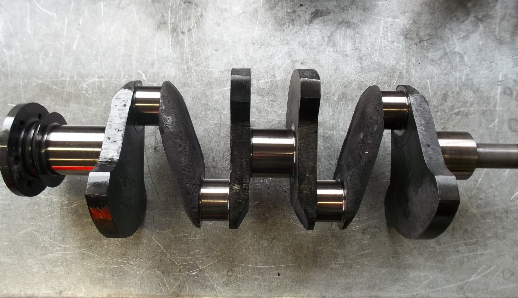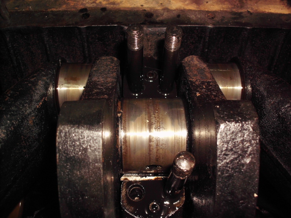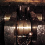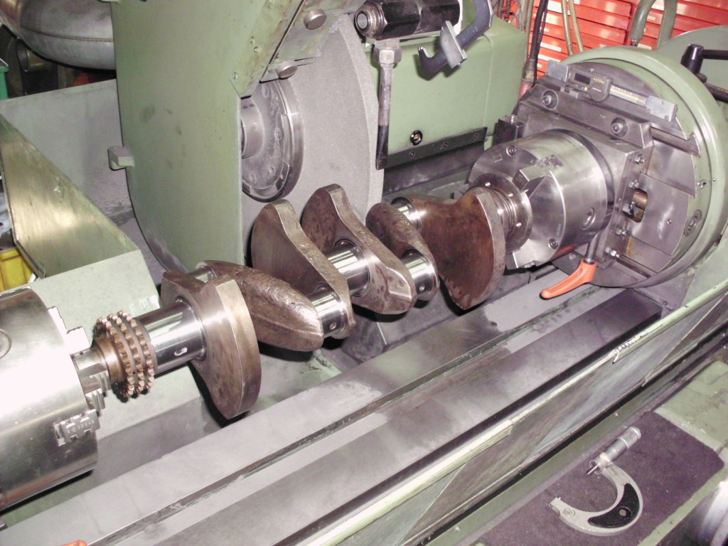 die Kurbelwelle zeigte deutlichen Verschleiß an Haupt und Pleuellagerstellen. Die Lager sahen adäquat aus. Im Normalfall wird der Block mit neuen Weißmetallagern ausgerüstet. Diese werden dann nachdem die Welle sauber geschliffen ist, auf entsprechendes Maß gebohrt. Wir entschieden uns für die Variante, den Block mit modernen Lagerschalen auszurüsten. Die Hauptlagergasse wurde zur Aufnahmen von Lagerschalen gebohrt und die Welle entsprechend geschliffen. In einem evtl. notwendigen Reparaturfall, können dann einfach u. kostengünstig nur die Lagerschalen ausgewechselt werden. Nach dem Schleifen wurde die Welle nitriert. Diese Härteverfahren bewirkt eine harte, verschleißfeste Randschicht. Um ein möglichst schwingungsarmen Motorlauf zu erzielen, wurde die Kurbelwelle mit samt Schwungrad dynamisch feingewuchtet.