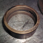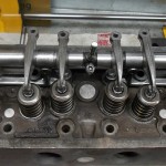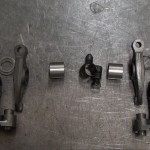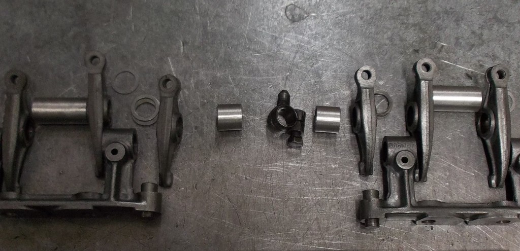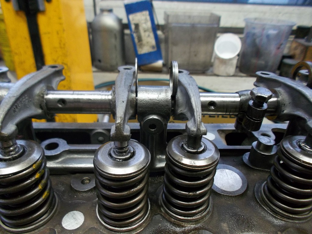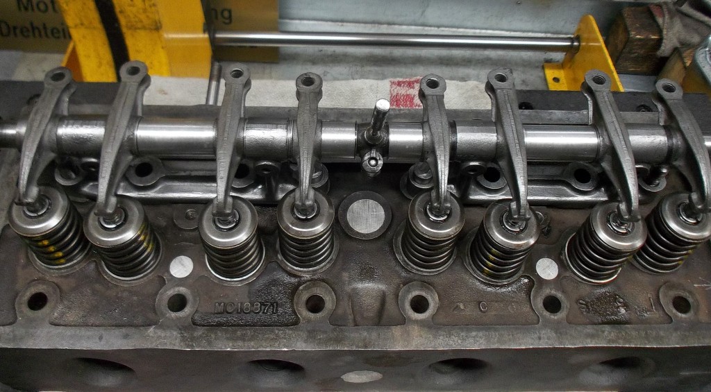 Die Federn zwischen den Kipphebeln, die der axialen Fixierung der Hebel dienen, verursachen Reibung an den seitlichen Hebelanlagen und an der Kipphebelwelle. Die Reibung bedingt unweigerlich Verschleiß und Abrieb an Kipphebeln u. Welle. In diesem Fall verursachten die Federn sogar sehr deutlichen Verschleiß auf der Kipphebelwelle. Aus diesem Grund entschieden wir uns für die Umrüstung auf Paßbüchsen zur axialen Fixierung der Hebel. Mit Paßscheiben wird die zentrische Lage der Kipphebel über den Ventilen festgelegt. In dieser Position kann der Abstand zwischen den Hebeln ausgemessen werden, um die Paßbüchsen anfertigen zu können.