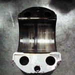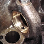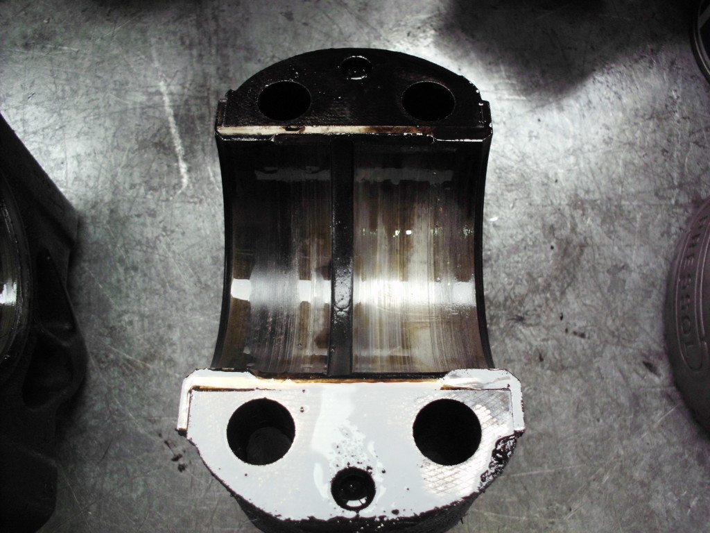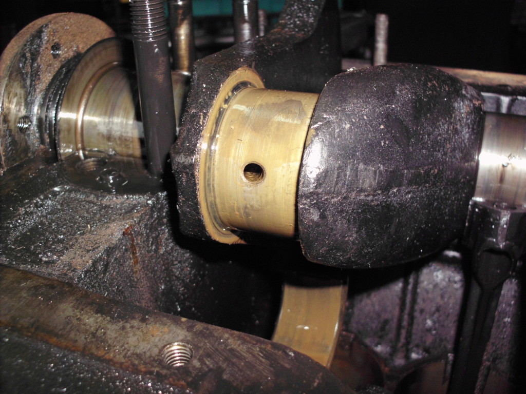 das große Pleuelauge war ursprünglich in Weißmetall ausgegossen. Dieser alte Lagerwerkstoff ist für hohe Beanspruchungen weniger geeignet. Weiterhin ist die Aufarbeitung sehr aufwendig. Die Pleuel müßten mit neuem Lagerwerkstoff ausgegossen werden und anschließend mechanisch bearbeitet werden um auf den geschliffenen Pleuelzapfen angepaßt zu werden.