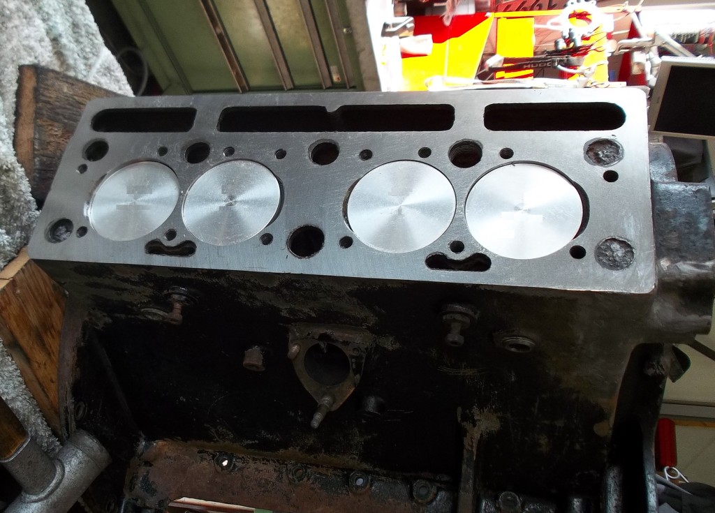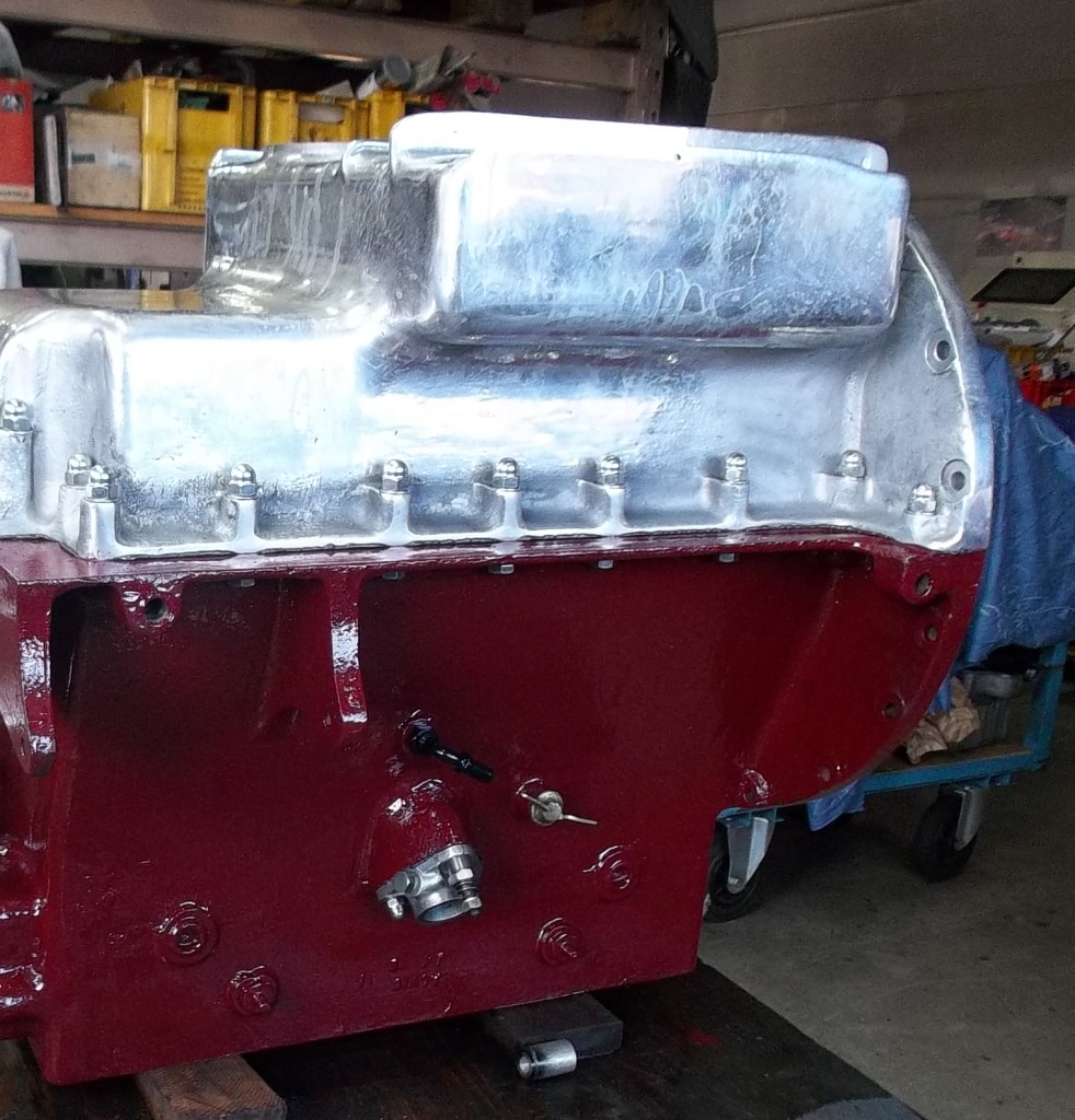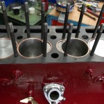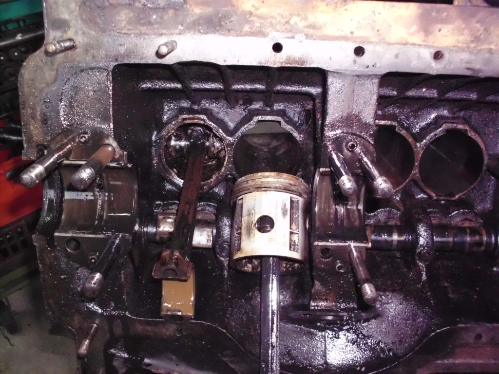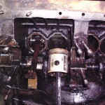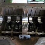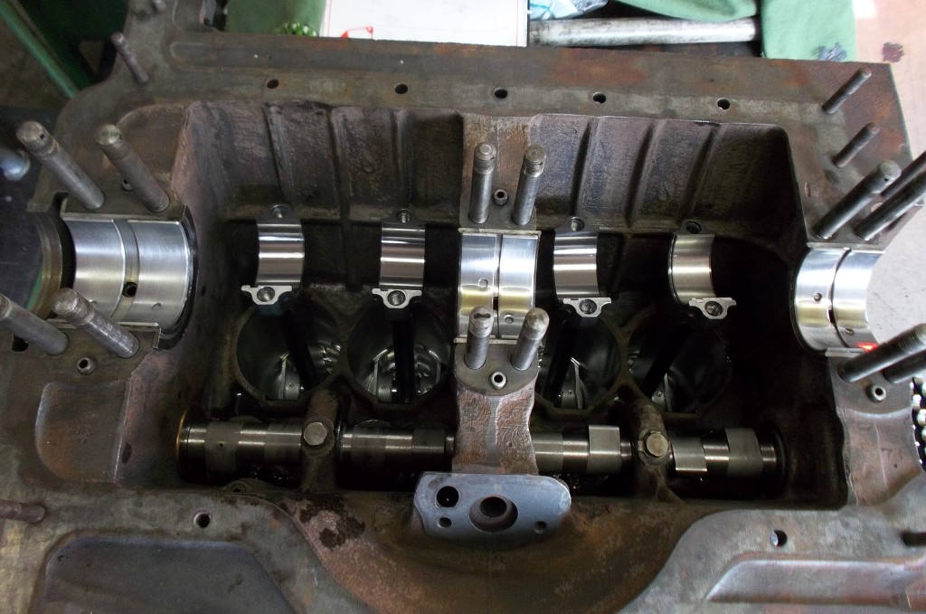 Zu Anfang wird der Rumpfmotor montiert. Wie bei einigen Motoren dieses Jahrgangs, müssen die Pleuel von unten durch die Zylinderlaufbahnen geführt werden um dann auf der Oberseite die Kolbenbolzen in den Kolben montieren zu können. Dann werden die Kolben von oben mit Hilfe eines Montagewerkzeuges in die Zylinder eingeführt. Die Pleueldeckel werden entfernt und die Pleuellager eingelegt. Jetzt ist es Zeit für die Montage der Hauptlager. Da jetzt noch freier Zugriff im Kurbelgehäuse ist, kann jetzt noch die Nockenwelle einfach durch die Lagerbüchsen geführt werden. Mit reichlich frischen Öl benetzt, wird die Kurbelwelle in die Lager eingelegt und die Hauptlagerdeckel verschlossen. Die Pleuel können jetzt vorsichtig auf die Kurbelzapfen gezogen werden und die Pleuel verschraubt werden. Anschließend wird noch die Ölpumpe montiert.