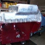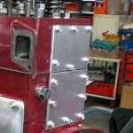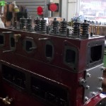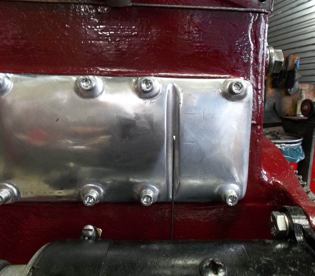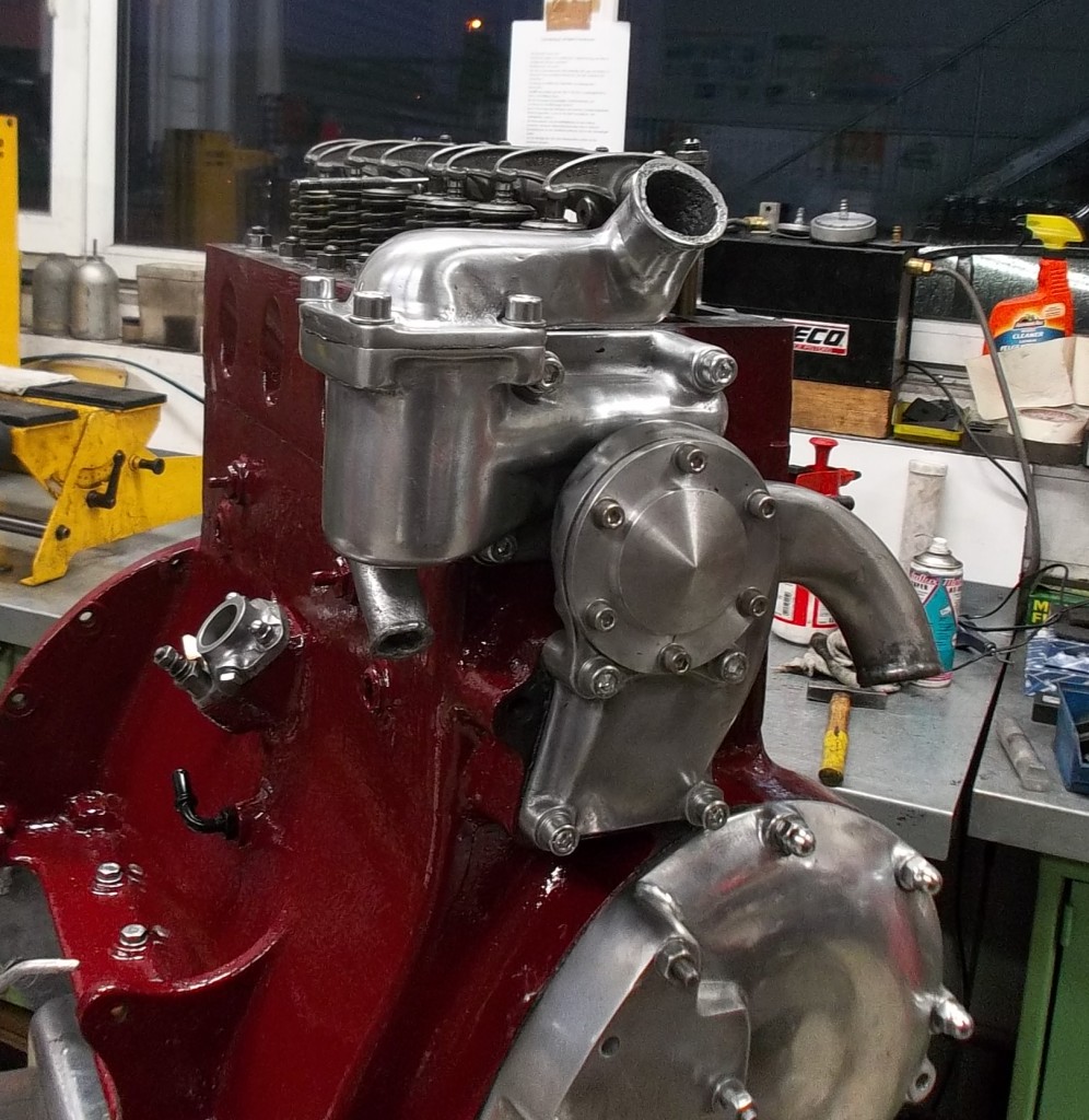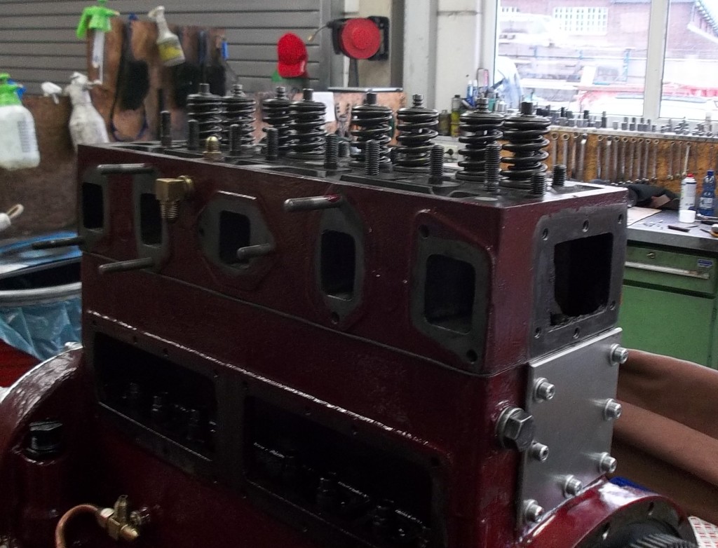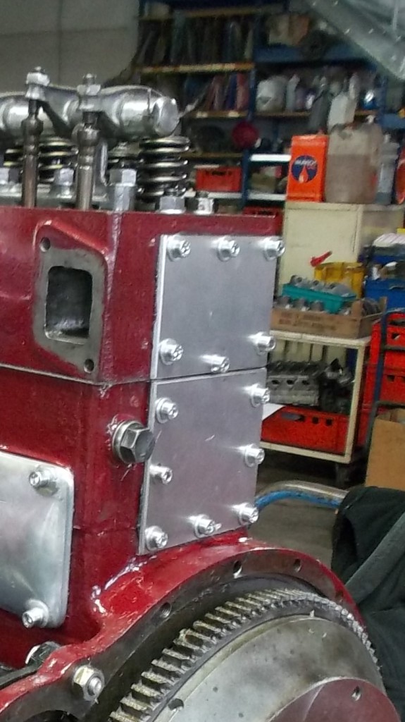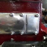 Jetzt kann es an der Oberseite weiter gehen. Die Stehbolzen können eingeschraubt werden, die angefertigte Kopfdichtung kann aufgelegt werden und der Zylinderkopf kann montiert werden. Für die Öffnungen des Wasserkreislaufes an der Rückseite des Motors wurden neue Aluminiumverschlußplatten angefertigt. Auf die Einstellung der Steuerzeit gehe ich hier nicht mehr gesondert ein. Dies ist im Abschnitt zur Nockwenwelle schon beschrieben. Bevor der Auspuffkrümmer befestigt wird sollten die aussenliegenden Elemente der Ölversorgung montiert werden. Zur Vervollständigung des Kustwerkes kann an der Vorderseite wieder der Stirndeckel u. die Wasseranschlüsse angebrachte werden. Das bearbeitete Schwungrad kann auch wieder an seinen alten Platz.