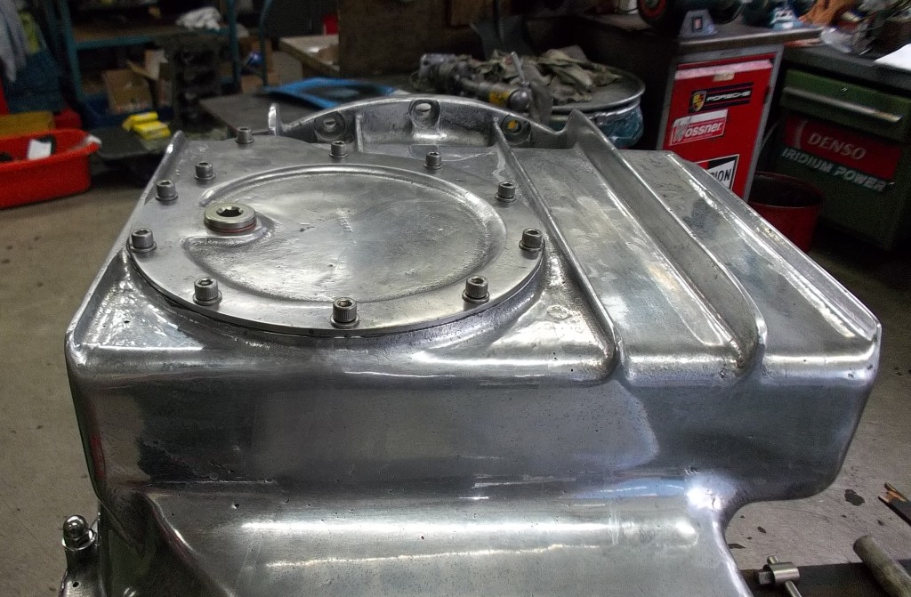 Von unten brauchen wir jetzt nicht mehr an den Motor und die Ölwanne kann montiert werden. Die wunderschön geformte Aluminiumwanne ist aufwendig gereinigt und poliert worden. Bevor der große Deckel, an der tiefsten Stelle der Wanne verschlossen wird, muß an die Montage des Ölstandsschwimmers gedacht werden. Dieses aufwendige Detail aus alter Motorenbaukunst, zeigt uns den Ölstand am Seitendeckel des Motors an.