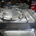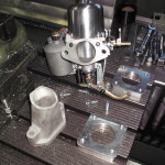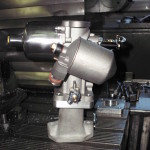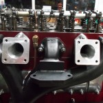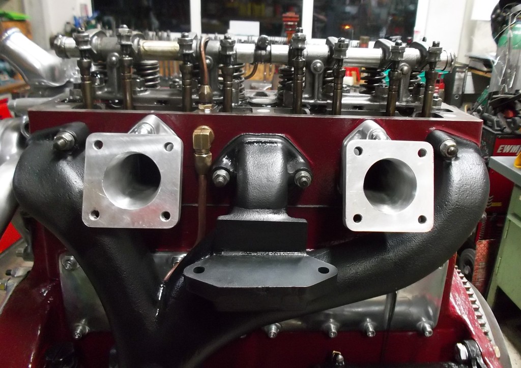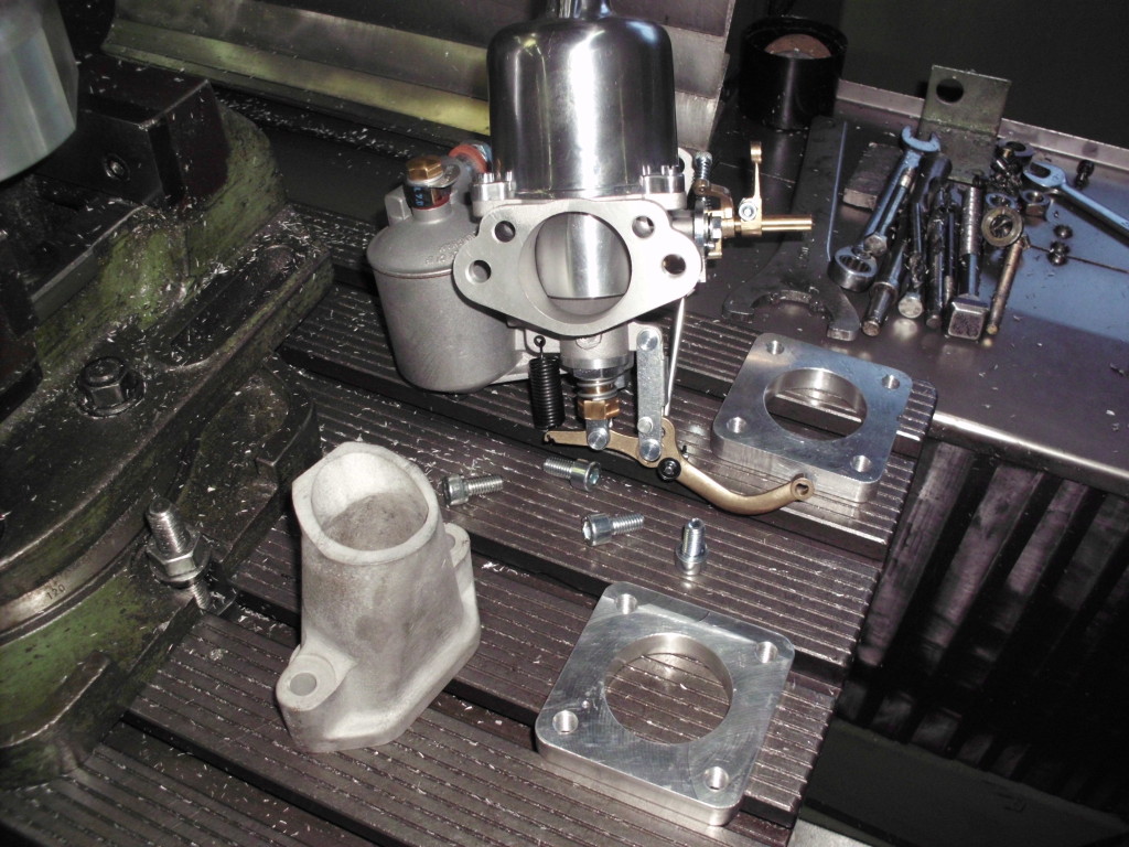 die ursprüngliche Gemischaufbereitung mit einem SU Vergaser mußte einer leistungfähigeren Alternative weichen. Zwei SU H6 Vergaser sollen in der Zukunft ausreichend „Futter“ für die Verbrennung liefern. Vom Seriensaugrohr verwendeten wir die Anschlußflansche am Zylinderkopf. Hierzu trennten wir diese vom alten Saugrohr ab. Auf der Fräsmaschine wurden Anschlußflansche für den H6 Vergaser gefräst. Diese Flansche schweißten wir an die Anschlußstücke des alten Saugrohres. Anschließend mußten noch Schweißnähte verputzt und Übergänge angepaßt werden.