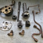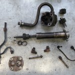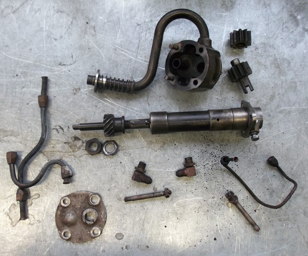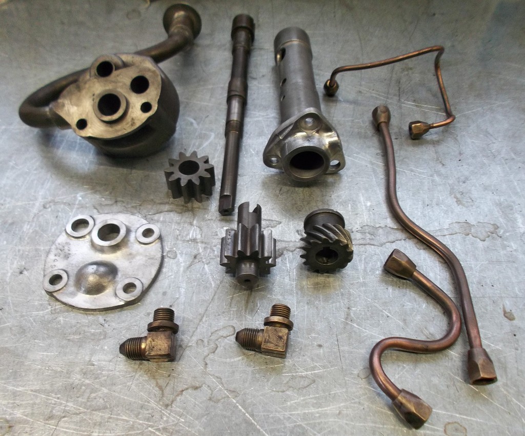 Zu einem gesunden Motor gehört eine gesunde Ölversorgung. Zur Kontrolle zerlegten wir die Ölpumpe in alle Bestandteile. Besonderes Augemerk legten wir auch noch auf das aussen am Motor verbaute Öldruckregelventil. Alle Bauteile wurden gründliche gereiningt und überprüft. Bei den Zahnrädern der Pumpe konnten wir auf gut erhaltene Gebrauchtteile zurückgreifen um die Pumpe wieder montieren zu können. Das Öldruckregelventil zeigte sich nach der Reinigung in bestem Zustand. Somit sollte nichts einer guten Ölversorgung entgegensprechen.