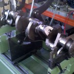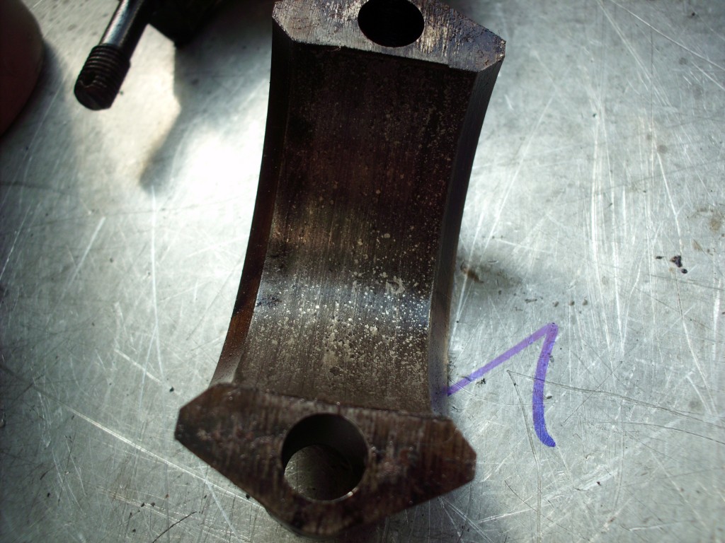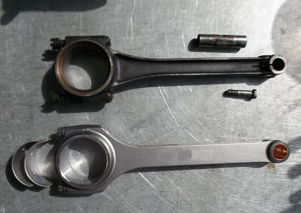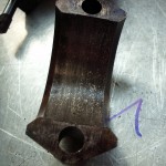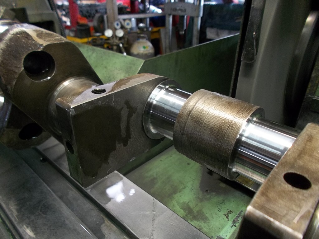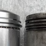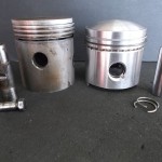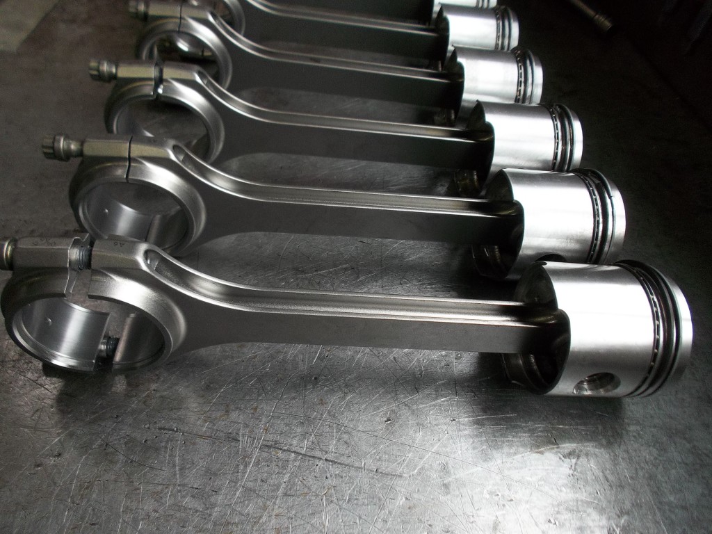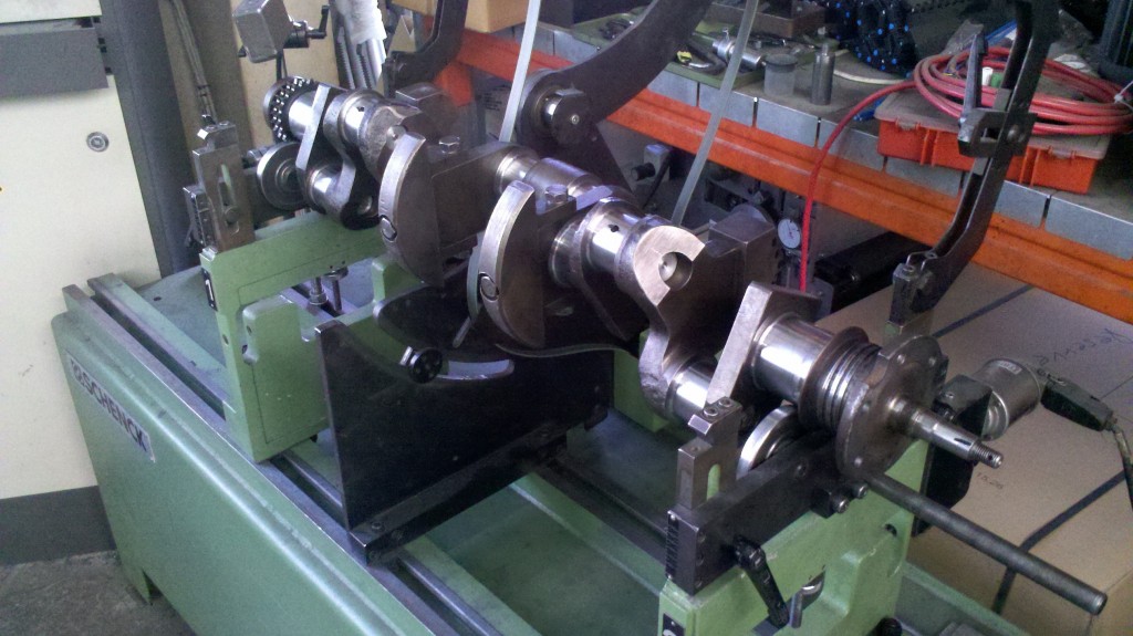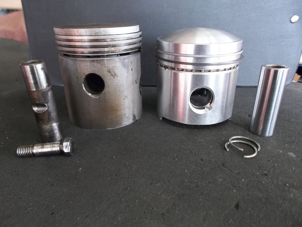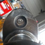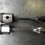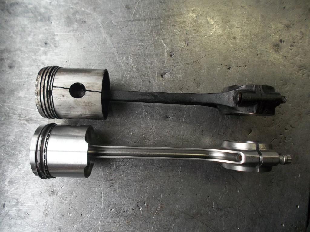 bevor es an die Bearbeitung der Kurbelwelle geht, müssen die angeschraubten Gewichte demontiert werde. Um die Welle von den Ablagerungen der letzten Jahrzehnte befreien zu können, müssen die Verschlußstopfen der hohlgebohrten Hubzapfen entfernt werden. Nach der Reinigung kann die Welle geschliffen werden. Bei der Pleullagerung haben wir uns für die Umrüstung auf neue gefertigte Pleuel mit Lagerschalen entschieden. Die Neugestaltung der Pleuel bringt den Vorteil mit sich, auch in der Kolbengestaltung im Sinne der Leistungssteigerung freier planen zu können. Mit längeren Pleuel können die Kolben kürzen gestaltet werden und laufen trotzdem höher in den Brennraum. Im Zusammenhang mit dem erhöhtem Kolbenboden erreichen wir eine Verdichtungserhöhung von vormals 5,6:1 auf fast 8:1. Der Kolbenbozen wird stärker ausgeführt um den erhöhten Zylinderdrücken dauerhaft stand zu halten. Der Kolben wird mit schmaleren Ringen ausgestattet, die im Bezug auf Reibung und Verschleiß, dem alten Ringpaket weit überlegen sind. Der neue Kolben ist trotz Hubraumvergrößerung und erhöhter Verdichtung 13{20de0094b84ab31f15d8e893bd427a4a876ff73c91e9d8d921ea99031f098016} leichter als die Urversion.