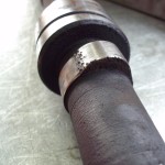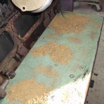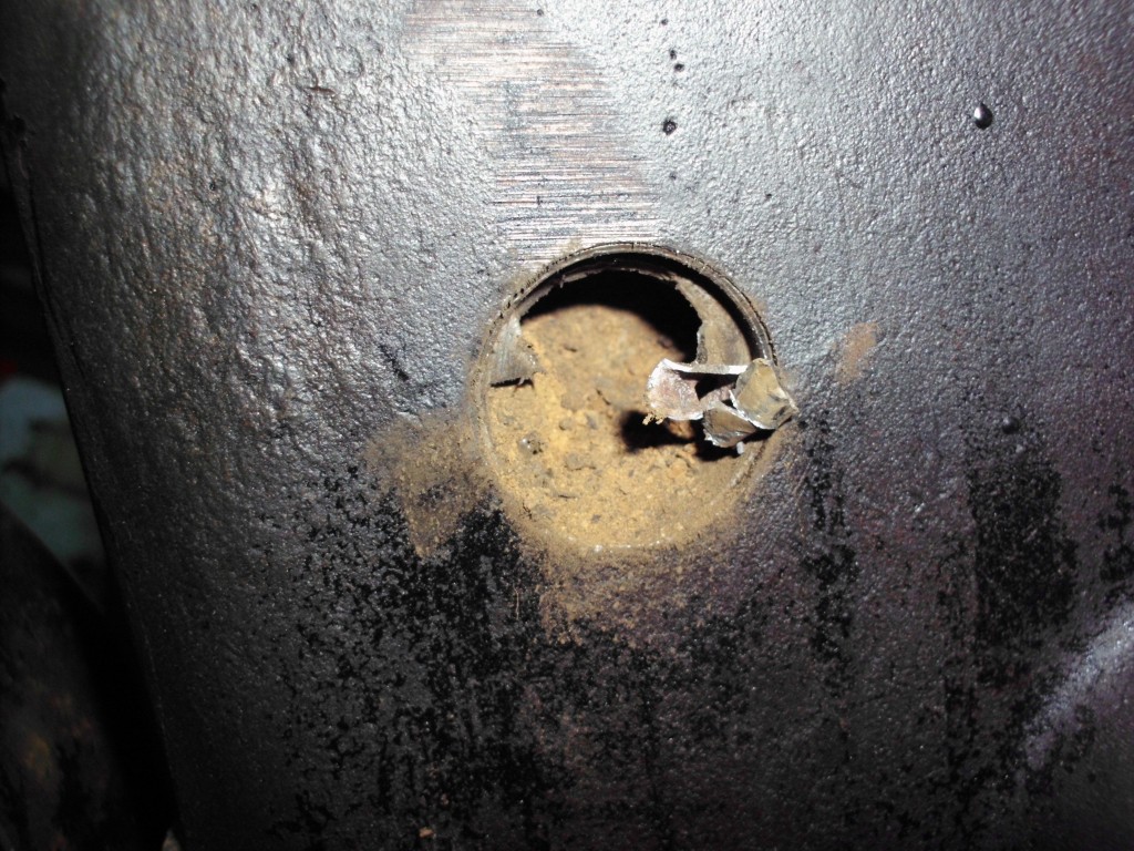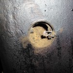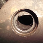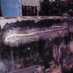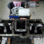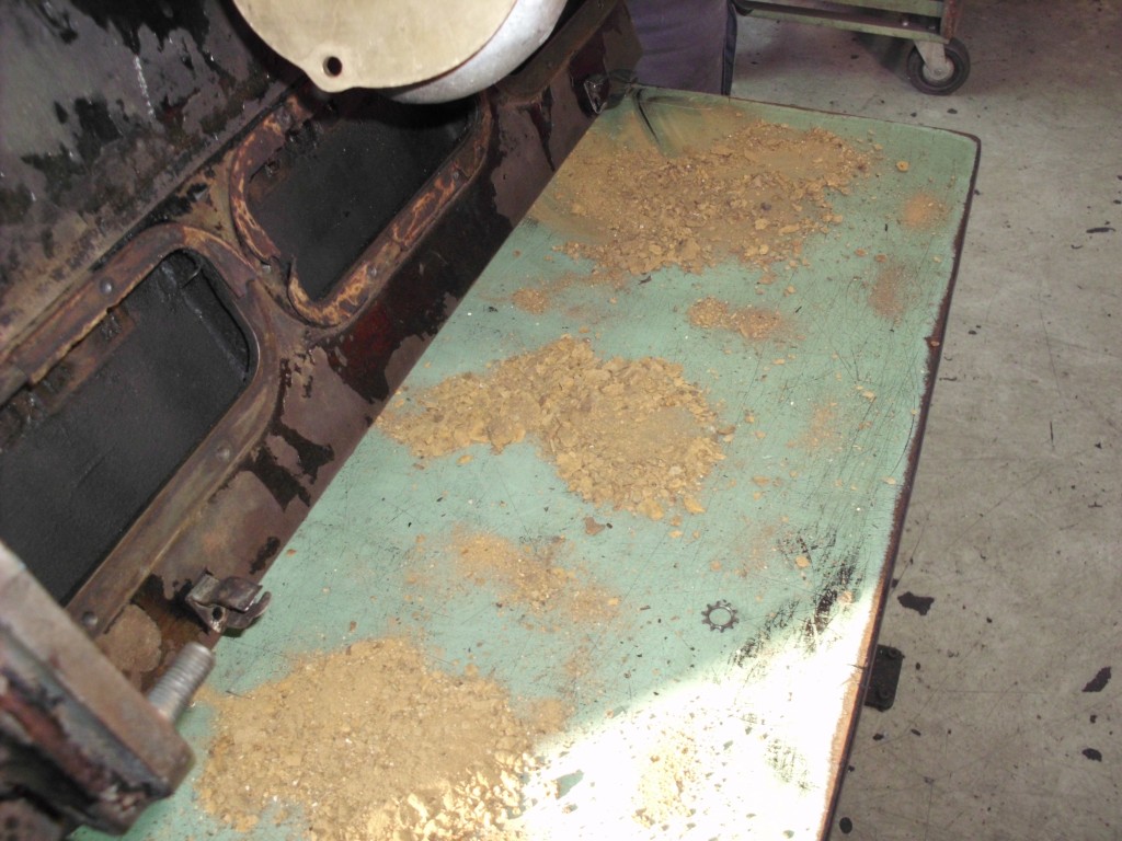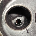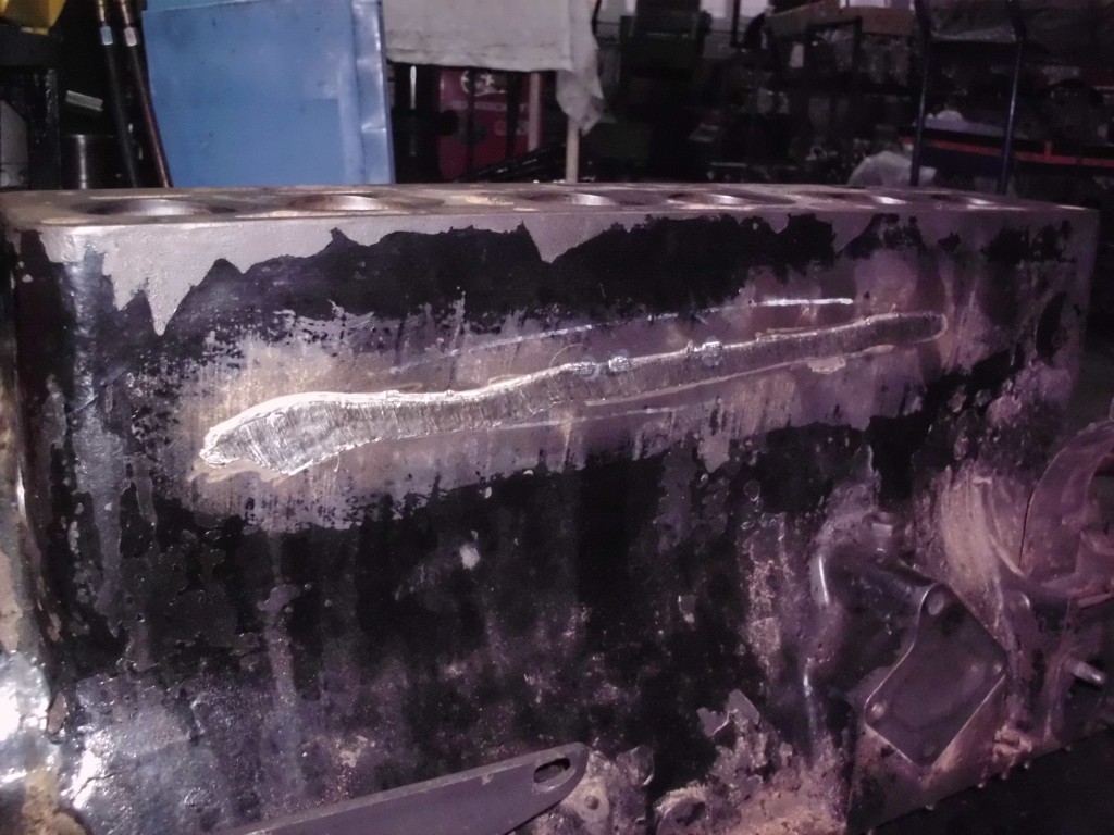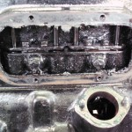 zentrales Thema zur Rettung des alten Motors war natürlich der große Riß im Block. Die aussichtsreichste Reparaturmöglichkeit für diese Fälle stellt das Laserschweißverfahren dar. Vor der Schweißung mußte der Motor noch von den starken Rostablagerungen befreit werden. Die beiden Froststopfen an der Vorder-und Hinterseite des Blocks wurden entfernt. Der seitlich eingeklebte Spiralschlauch, über den die Wasserpumpe mit dem Motor verbunden war, mußte ebenfalls entfernt werden. Berge von Rost kamen zum Vorschein.