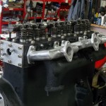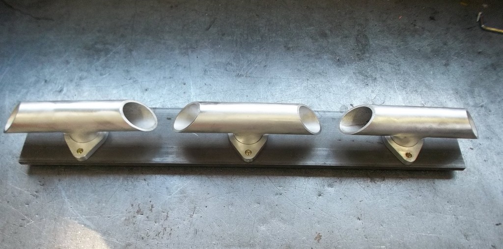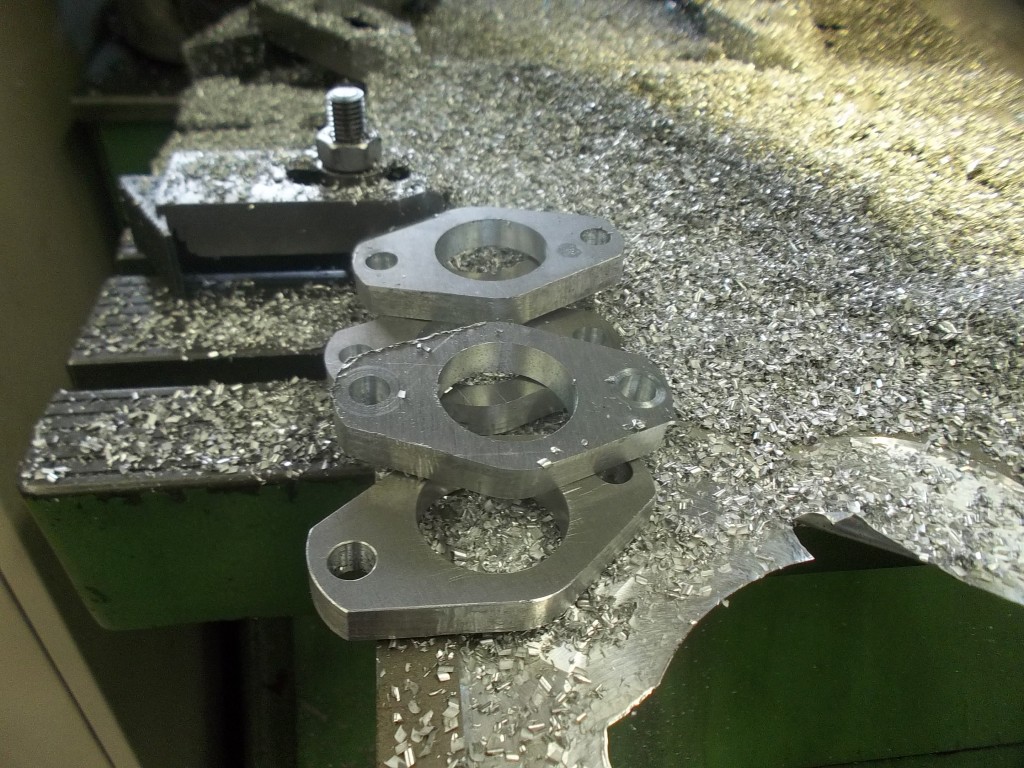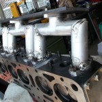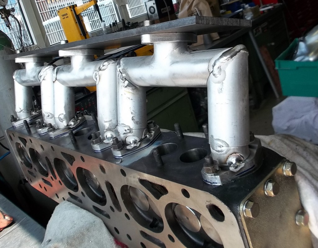 Nach der Aufnahme aller Maße am Zylinderkopf wurde eine stabile Schablone für die Fixierung der Vergaseranschlüsse angefertigt. Die Vergaseranschlüsse wurden gefräst und alle Einzelteile des Rohre zugeschnitten. Auf dem Zylinderkopf und der Schweißschablone fixiert, werden die Einzelteile Stück für Stück zusammengeschweißt. Nach dem Schweißen mußten die Nähte noch von innen und aussen verputzt werden.