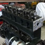 bei diesem Motor haben wir es mit einem seltenen Aufbau der Ventilsteuerung zu tun. Auf der seitlich unten liegenden Nockenwelle laufen Stößel. Diese Stößel sind zu je 4 in einem Stößelgehäuse zusammengeführt. Diese Stößelgehäuse sind kurz über der Nockenwelle angebracht. Die Stößel sind an der Berührungsfläche zur Nockenwelle kreisbogenförmig ausgeführt. In diesen Gehäusen geführt stehen die Stößelstangen in den Stößeln, die dann die Kipphebel im Zylinderkopf betätigen.