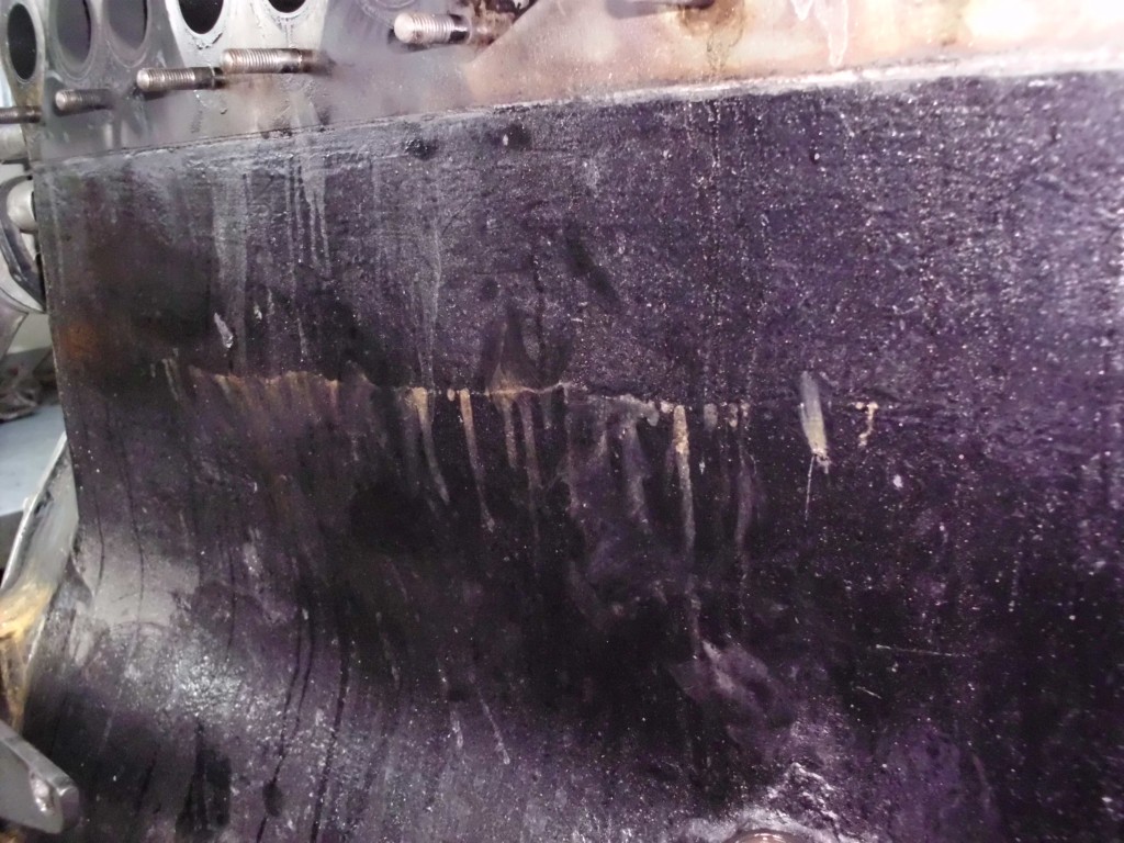Nach dem Lasern wurde der Block noch einer Druckprüfung unterzogen. Es zeigten sich noch wenige, sehr kleine Undichtigkeiten am Rande der Schweißung. Da jede Schweißung neue Spannungen in das alte Gußgehäuse bringen kann und damit auch neue Risse verursachen kann, entschieden wir uns im Austausch mit der Schweißfirma dafür, die Schweißung zusätzlich mit temperturbeständigem Kaltmetall zu verkleben. Mit dem Hintergrund, daß dieses Kühlsystem später, wie auch ursprünglich, drucklos betrieben wird, sollte die Dichtigkeit des Systems gewährleistet sein.