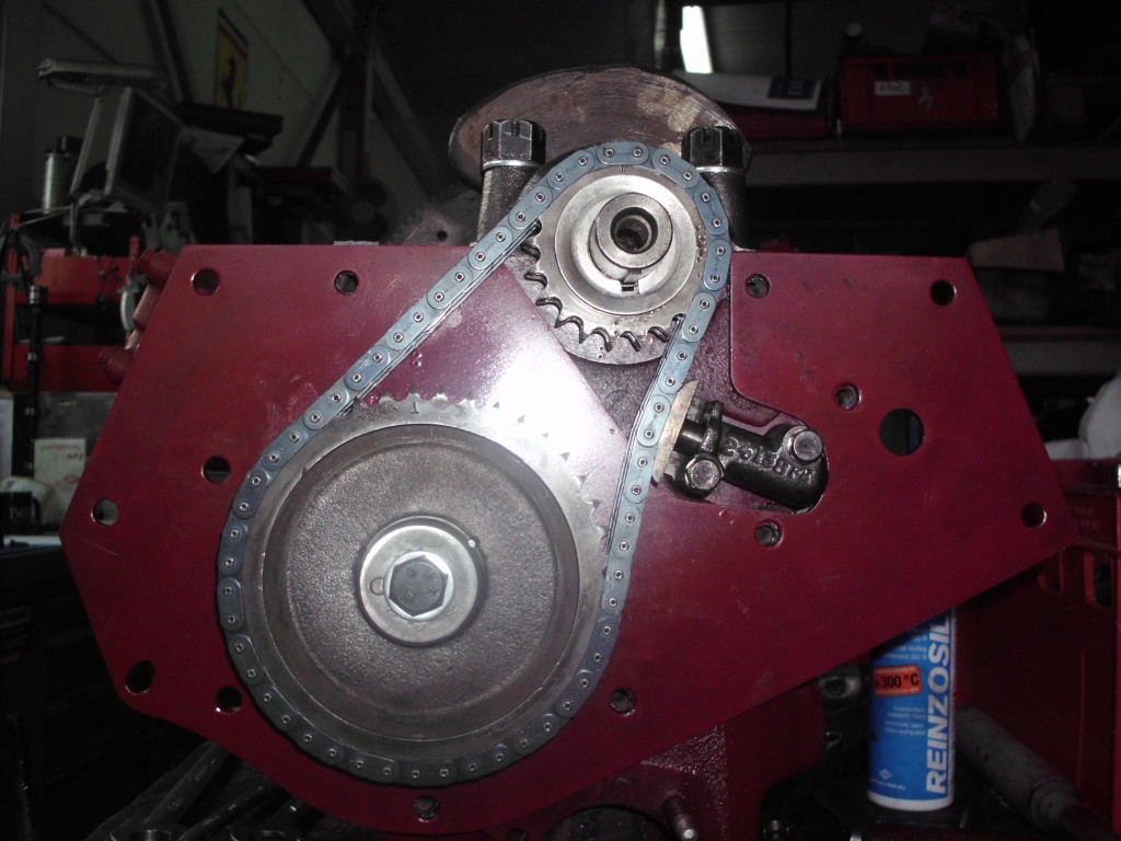 Komplett montierte Oldtimermotoren verlassen die Firma nicht, bevor sie einen Funktionstest erfolgreich bestanden haben. Der Motor wird mit Öl befüllt und auf einem Prüfständer montiert. Nur mit Anlasserdrehzahl bewegt, wird die Ölversorgung am Ventiltrieb überprüft und der nötige Druck im System kontrolliert.