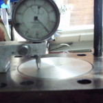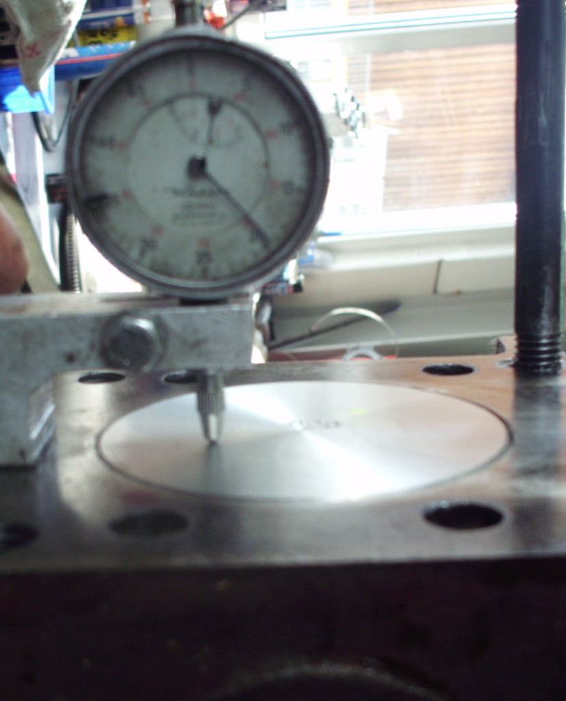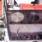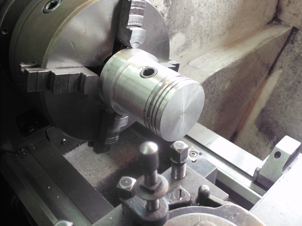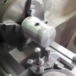 bevor alle Kolben auf die Pleuel montiert werden, müssen wir die Lage eines Kolbens in OT bestimmen. Der Motorblock muß noch plangefräst werden und wir wissen nicht was in vergangener Zeit schon an diesem Motor bearbeitet wurde. Aus diesem Grund wird die Kurbelwelle montiert und ein Kolben exakt in OT gedreht. Mit Hilfe einer Meßuhr wird der Überstand bezw. Unterstand des Kolbens ermittelt. Unter Berücksichtigung der Kopfdichtungsstärke, des noch anfallenden Abtrages beim Planfräsen und des gewünschten Verdichtungsverhälnisses wird die notwendige Kompressionshöhe des Kolbens berechnet. In unserem Fall mußten die Kolben geringfügig abgedreht werden. Mit Hilfe einer speziellen Vorrichtung können die Kolben auf der Drehbank entsprechend bearbeitet werden.