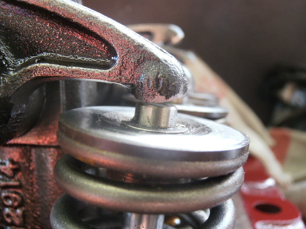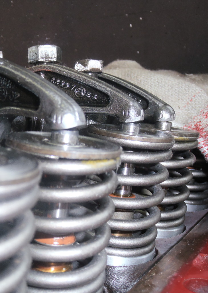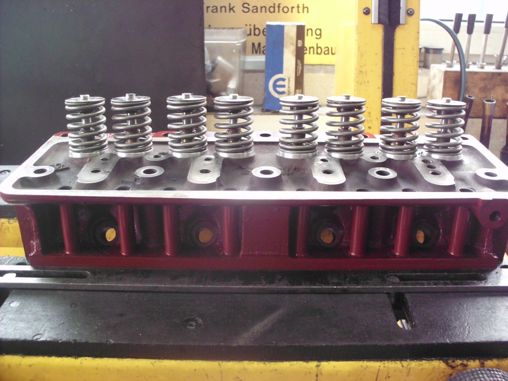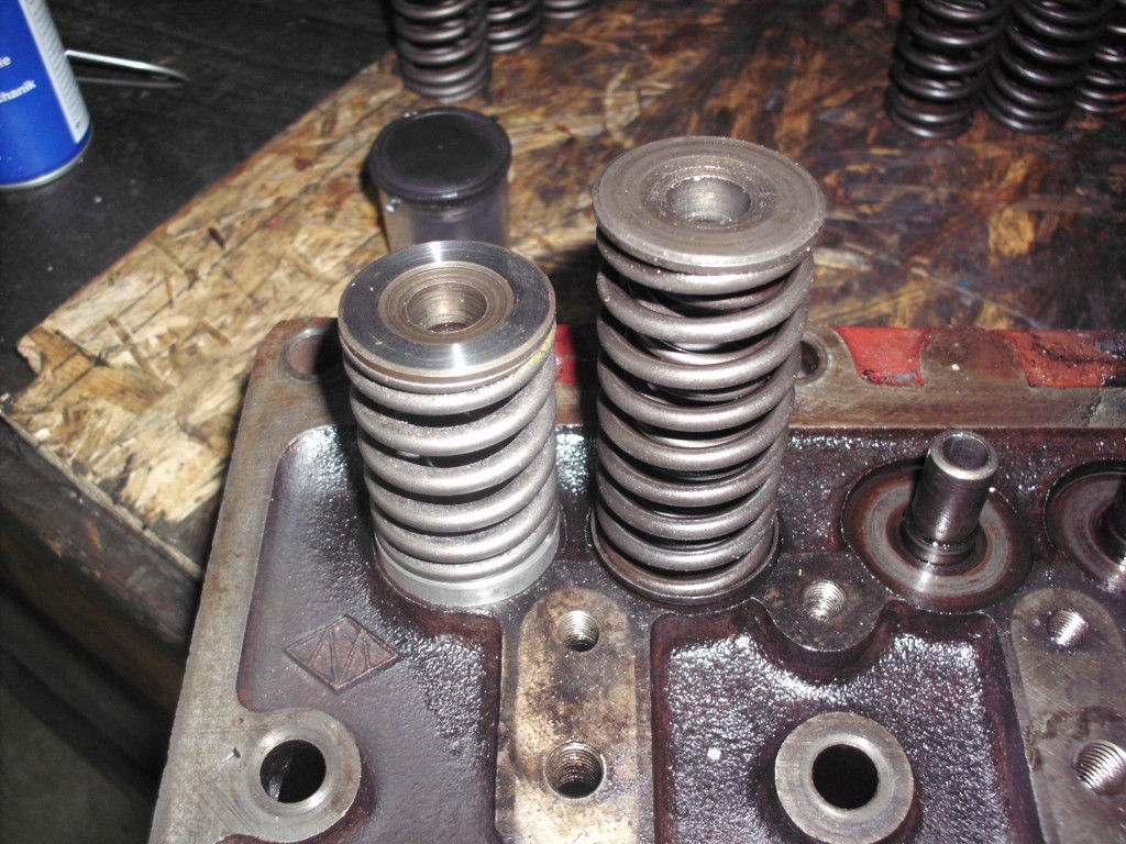 beim Zerlegen des Zylinderkopfes stellt sich die Frage der Ursache für die Schäden am Ventiltrieb. Eine zu starke Ausführung der doppelten Ventilfedern könnte Ursache, oder zumindest Mitverursacher des starken Verschleißes an Kipphebelwelle, Kipphebeln und Ventilenden sein.