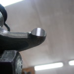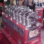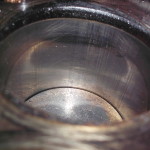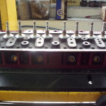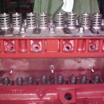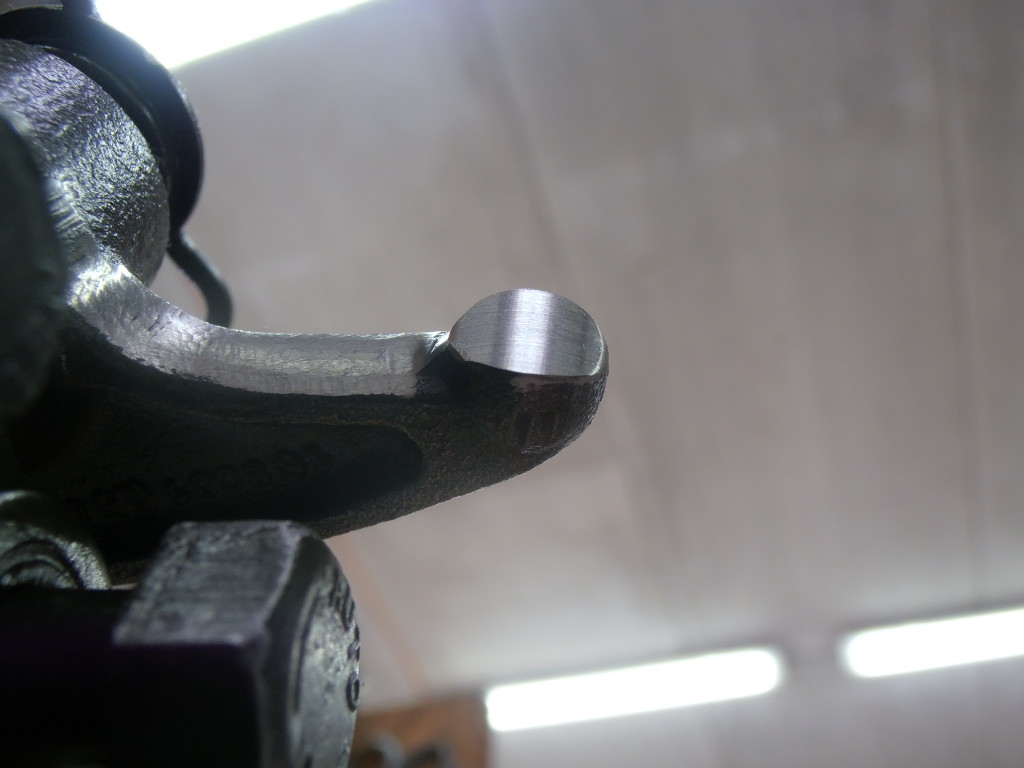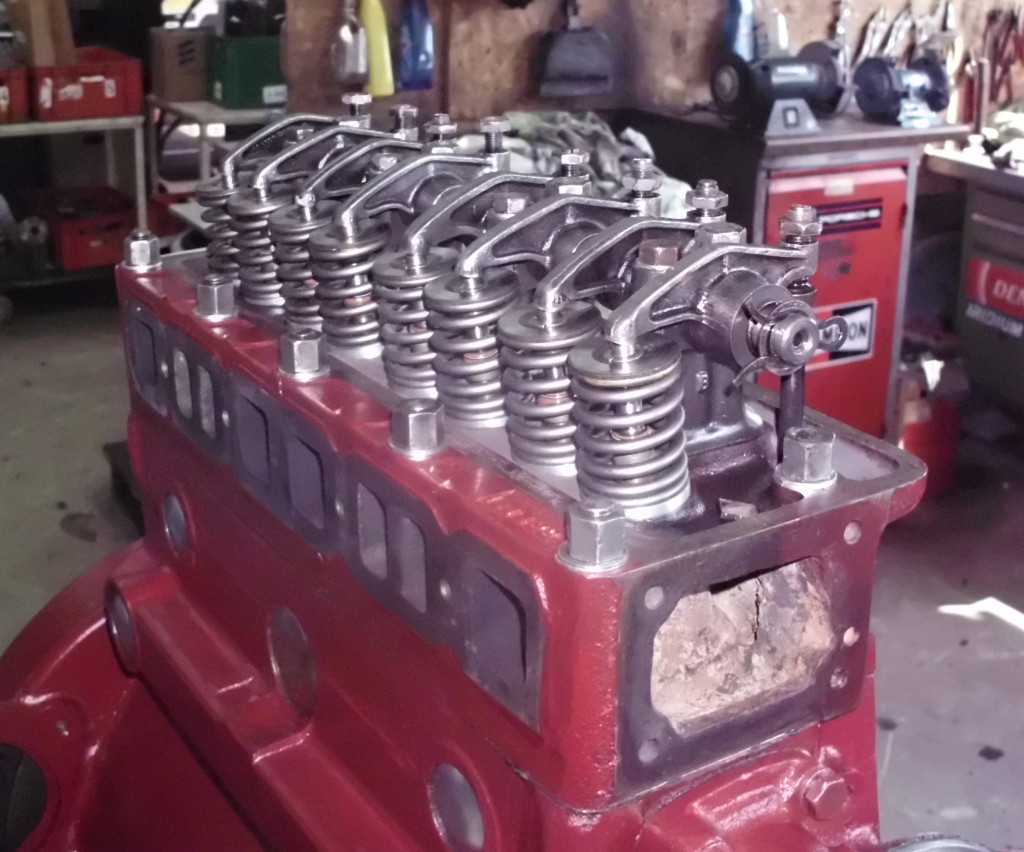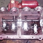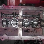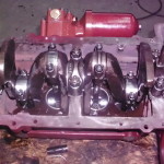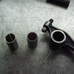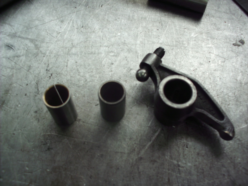 Kippehebel und Kipphebelwelle waren stark verschlissen. Auf Grund der guten Ersatzteilversorgung für diesen Motor konnten wir eine neue Kipphebelwelle und neue Lagerbüchsen für die Hebel beschaffen. Die ausgeschlagenen Lagerbüchsen wurden ausgepreßt und gegen Neue ausgetauscht. Die Lagerbüchsen wurden anschließend auf einer Honmaschine innen auf passendes Maß für die neue Welle bearbeitet. Eine exakte Führung der Hebel wieder gewährleistet. Um auch noch eine harmonische Abrollbewegung der Kipphebel auf den Ventilenden zu erzielen wurden die Radien neu geschliffen.