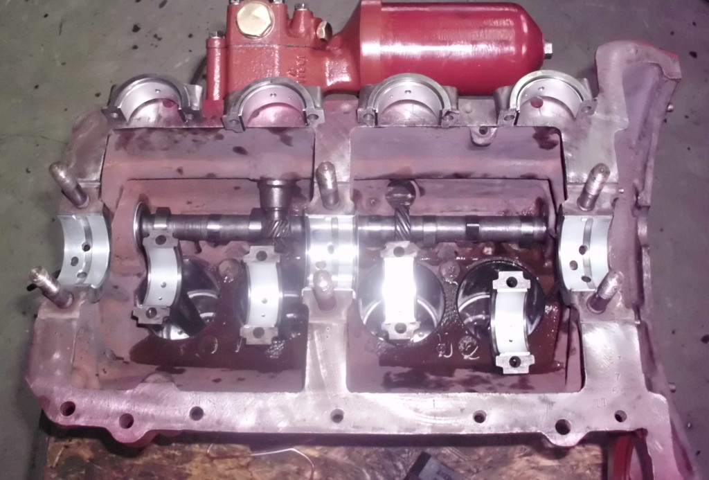 die Nockenwelle zeigte leicht Verscheißspuren an den Nockenspitzen und die Stößel wiesen ähnliche Verschleißspuren auf. Für unseren Motor kam daher nur eine 100{20de0094b84ab31f15d8e893bd427a4a876ff73c91e9d8d921ea99031f098016} Instandsetzung in Frage. Die Nockenwelle wurde geschliffen und die Stößel wurden geplant. Alles zusammen wurde dann noch zum Verschleißschutz nitriert. Bevor die Nockenwelle wieder in das Gehäuse eingebaut wurde, ist der Block noch mit neuen Nockenwellenlager ausgerüstet wurden.
