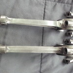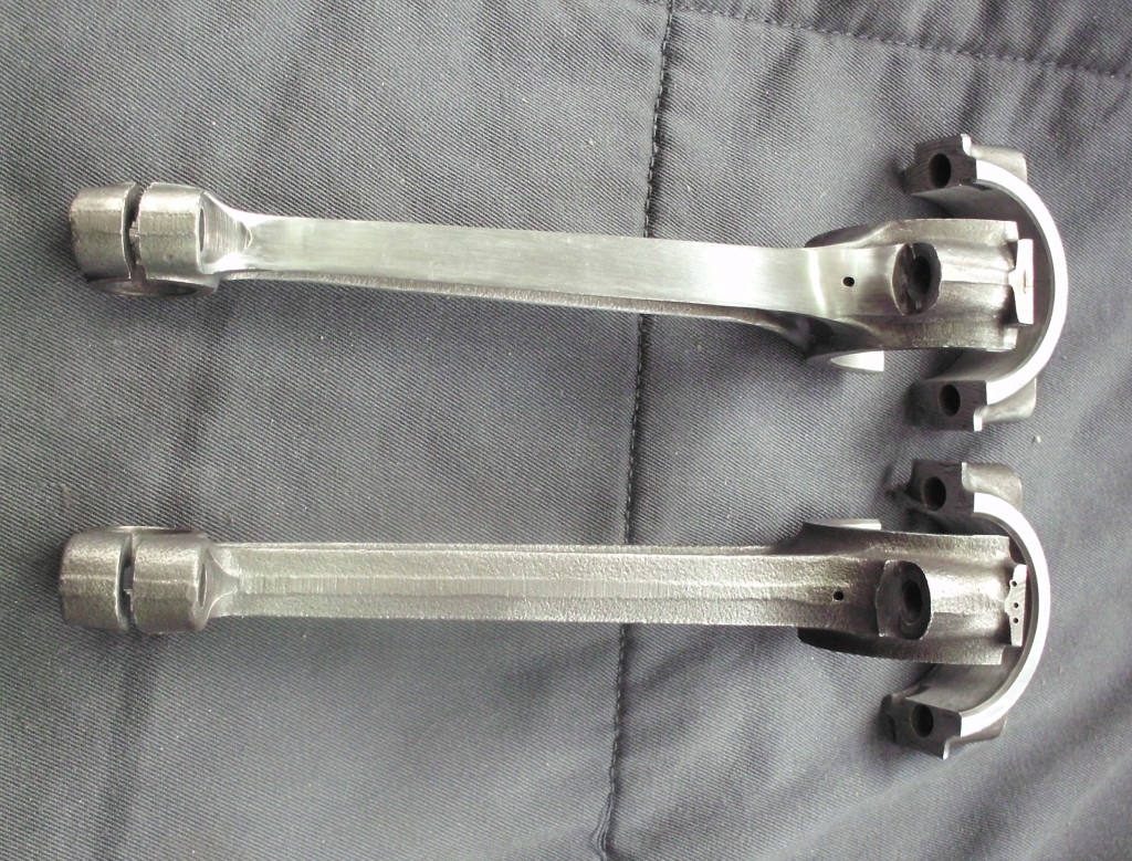 nach gründlicher Reinigung der Pleuel war ein Pleuel aus einer anderen Serie zu erkennen. In vergangener Zeit, muß bei einem Pleuellagerschaden, ein Pleuel ausgetauscht worden sein. Erhöhte Aufmerksamkeit bez. der Pleuel ist also geboten. Nachdem die Pleuelgrundbohrungen vermessen waren, die Pleuel auf Winkligkeit und die Stichmaße überprüft war, ging es an den nächsten Schritt. Die Pleuel wurden nach rottierenden und oszilierenden Massen getrennt ausgewogen. Und siehe da, das ausgetauschte Pleuel paßte nicht zu den Restlichen. Es war im Gesamtgewicht fast 40g leichter als die Anderen. 3 Pleuel mußten erleichtert werden. 11g an den oszilierenden Massen u. 29g an den rotierenden Massen. Weiterhin wurden die stark beschädigten und zu lang dimensionierten Klemmschrauben des kleinen Pleuelauges, gegen leichtere Inbusschrauben ersetzt. Die Reduzierung der oszilierenden Massen an einem Kurbeltrieb sind besonder interessant für das Schwingungsverhalten!