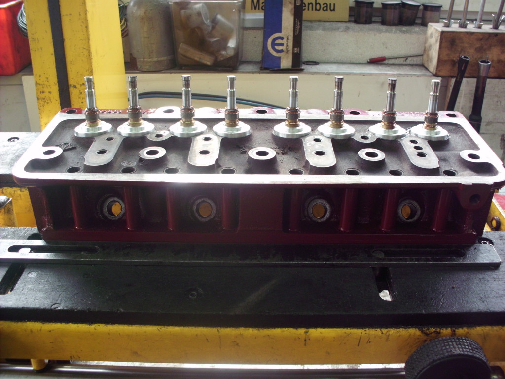 Die ursprüngliche Ventilführung waren nicht für die Verwendung von Schaftabdichtungen vorgesehen. Da die Ventilführungen auf Grund von starkem Verschleiß ausgetauscht werden mußten, konnten wir im gleichen Zuge auch die Verwendung von modernen Schaftabdichtungen einplanen. Ein Schaftabdichtung hätte aber keinen Platz in der kleinen Innenfeder gefunden. Um allen Ansprüchen gerecht zu werden, wurden statt Doppelfedern auf eine kräftige Feder ausgelegt. Entsprechend der neuen Feder mußten noch Federteller und Federunterlagen angefertigt werden, damit die Feder auch in der richtigen Vorspannung eingbaut ist.