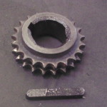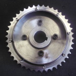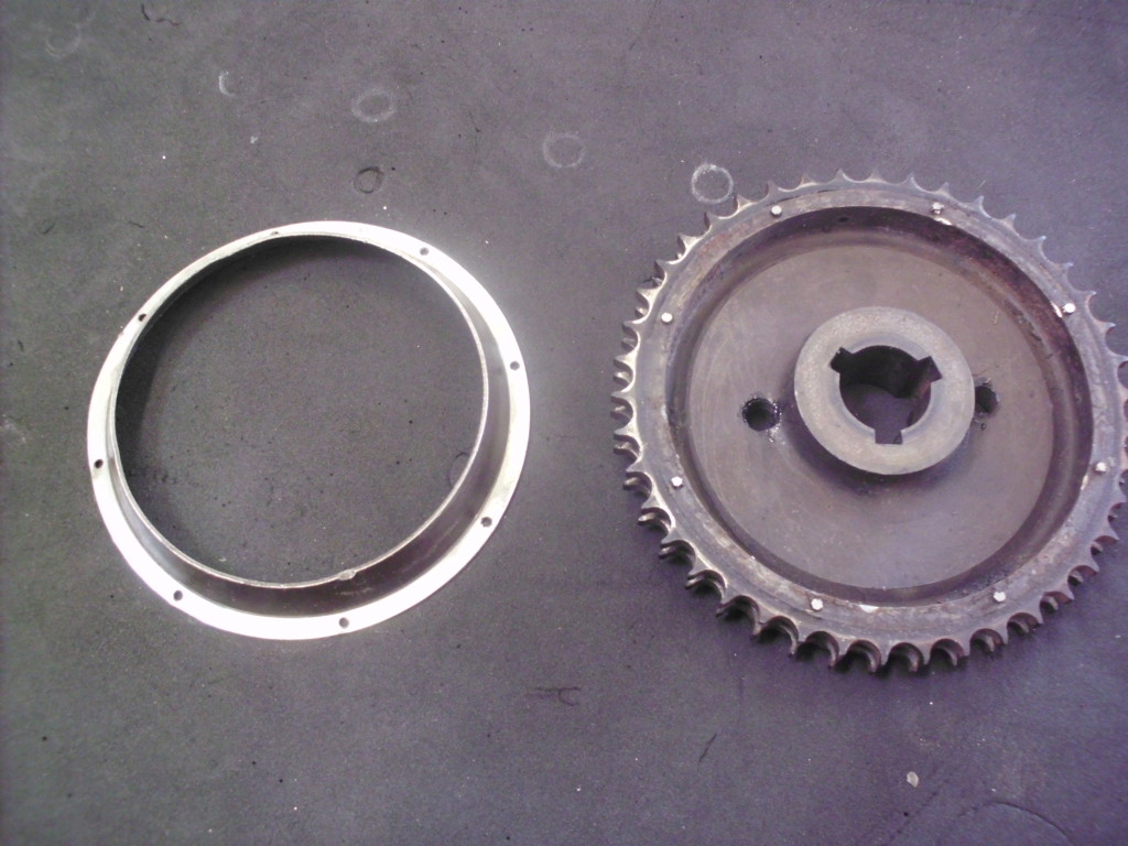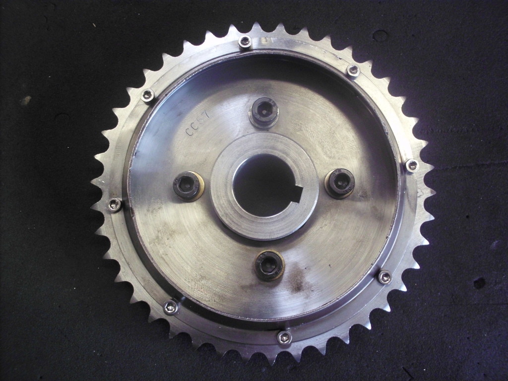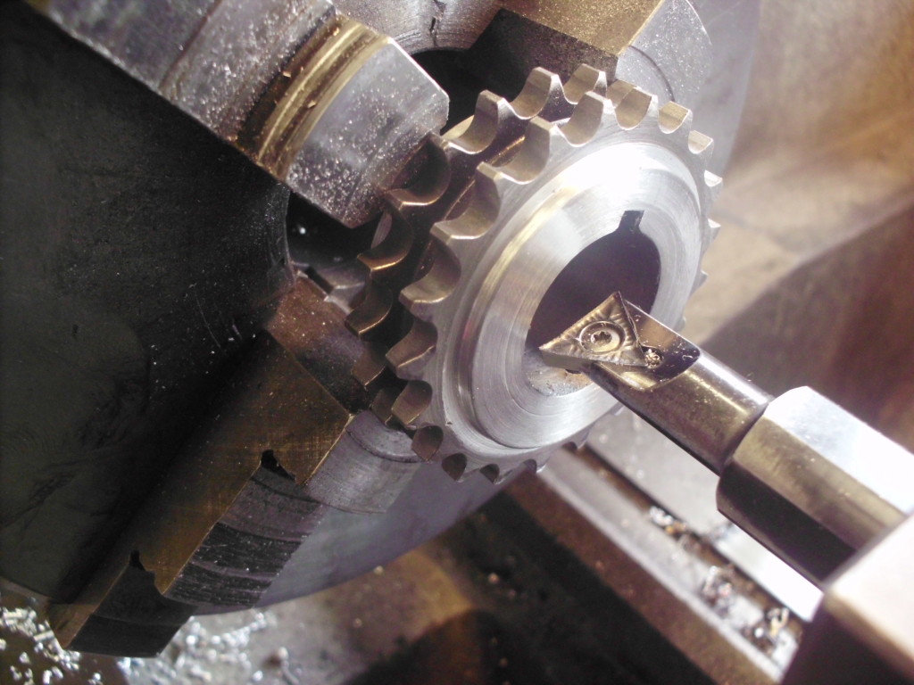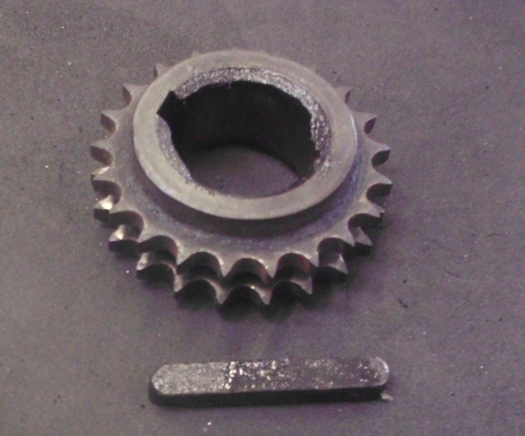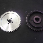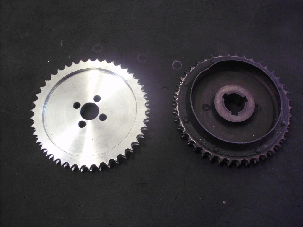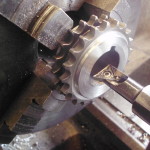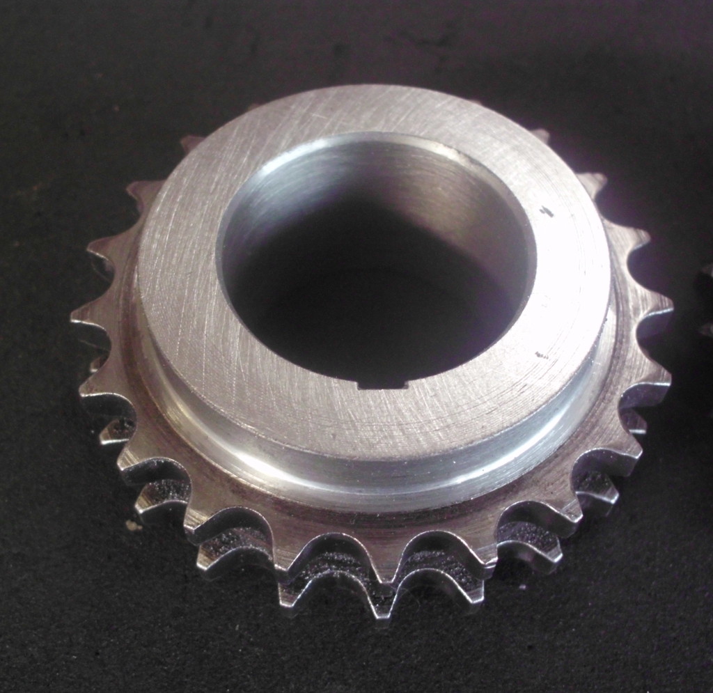 der Zustand des Kettenrades war ähnlich wie der des Rades auf der Nockenwelle. Wieder wurden wir im Fundus ähnlicher engl. Motoren fündig. Die beiden Kettenräder auf unserem Fund hatten die gleiche Zahnteilung, Durchmesser und Abstand der Zahnräder zueinander. An der Aufnahmen mußte jedoch Einiges geändert werden. Die Paßfedernut, der Innendurchmesser, die Breite….alles mußte angepaßt werden.