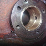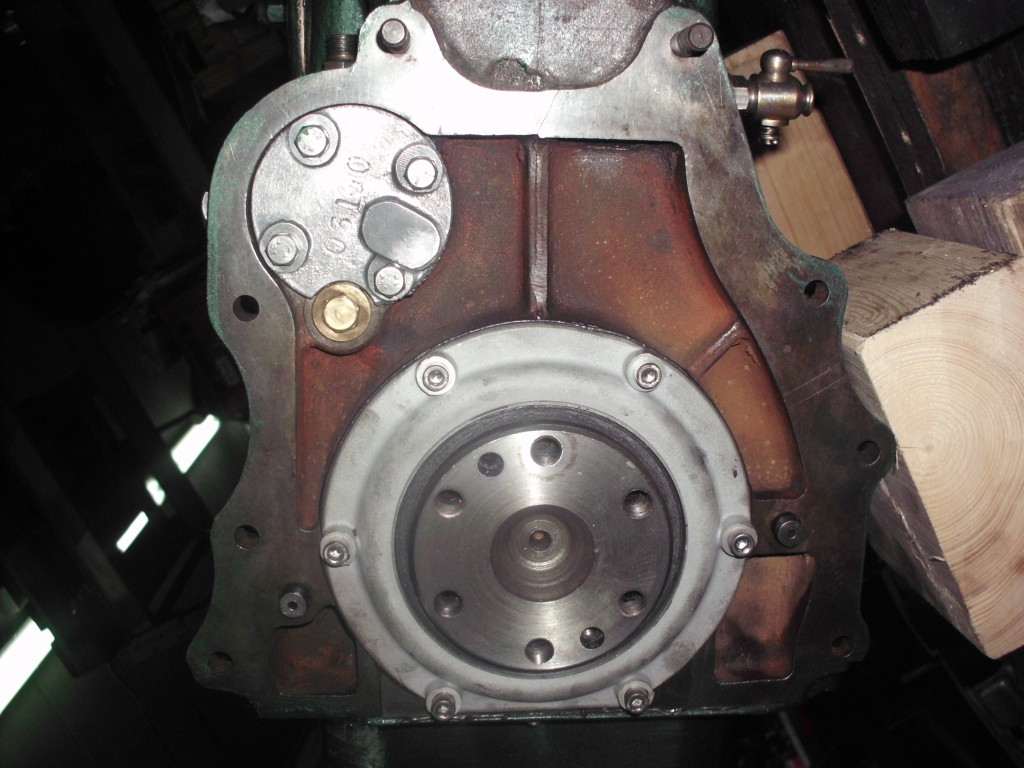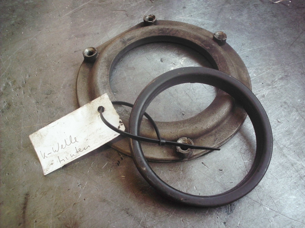 Auf dem Zapfen der Schwungradaufnahme war ein Blechring aufgepreßt, der im hinteren Aluminiumgehhäusedeckel gegen Ölaustritt abdichten sollte. Mit dem verbogenen u. verostetene Blechring in einem ausgeschlagenen Aluminiumdeckel wäre diese Abdichtfunktion nicht mehr zu erwarten. Nach etwas Suche im Repertoire der heutigen Wellendichtringhersteller sind wir auf einen Ring gestoßen der uns nach etwas Umbau eine gute Abdichtfunktion sicherstellen sollte.