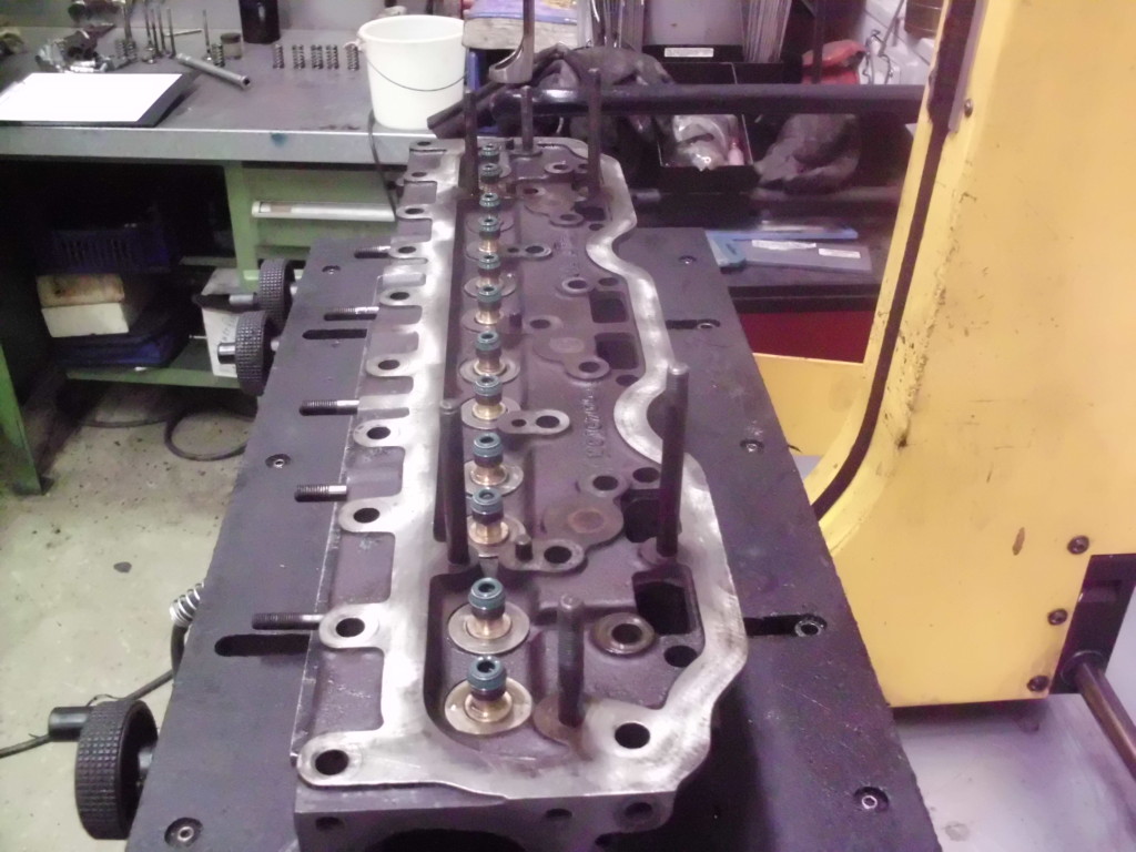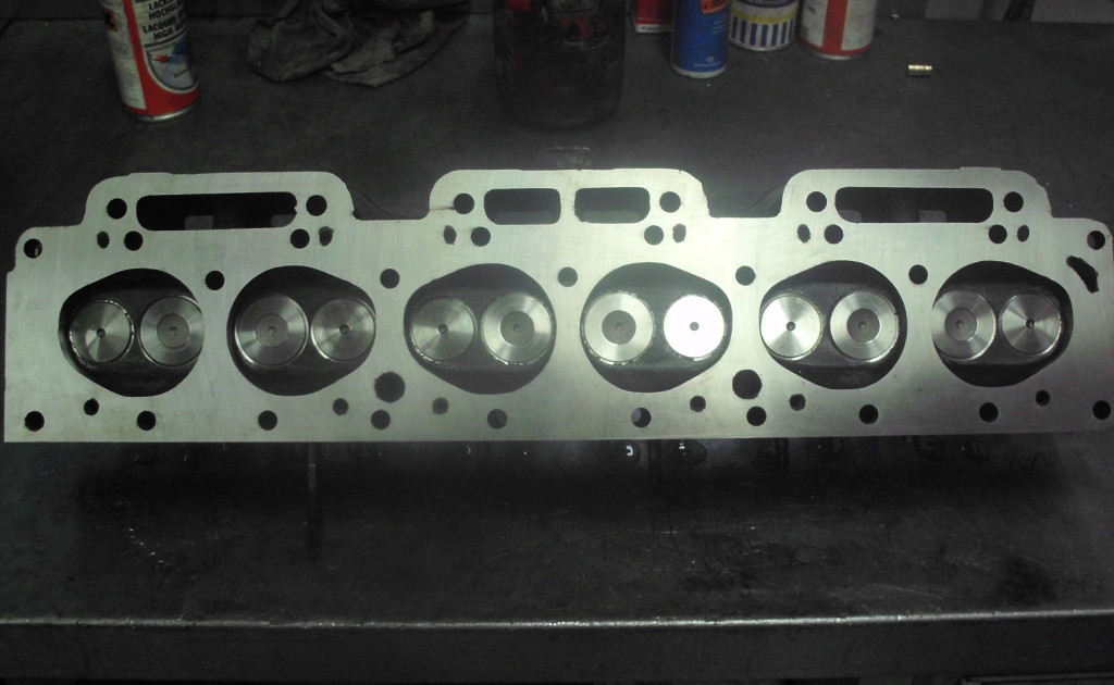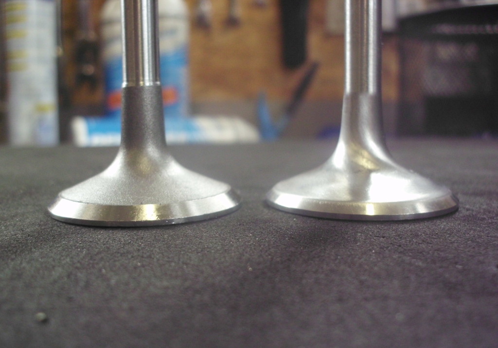 Ventile: Durch Umstellung auf metrische Schaftdurchmesser, können die Ventile in hochwertigen modernen Werkstoffen ausgeführt werden, die einen problemlosen Bleifreibetrieb sicherstellen. Ein- und Auslaßventil wurden 1 mm größer gewählt und der Schaftdurchmesser beträgt jetzt 7 mm. Selbstverständlich bedingt dieser Schritt auch die Verwendung neuer Ventilkegelstücke mit neuen Federtellern. Entsprechend der neuen Ventilschäfte wurden Bronzeventilführungen angefertigt, die zur Aufnahmen von Schaftabdichtungen vorgerichtet sind. Die Ventilführungen für die Einlaßkanäle wurden kanalseitig besonders schlank ausgeführt um einen möglichst großen freien Kanalquerschnitt zu erzielen. Die Ventilsitze wurden auf unserer modernen Sitzfräsmaschine dem größeren Ventildurchmesser entsprechend bearbeitet und mit Hilfe eines Innenkorrekturwinkels ströhmungsgünstig an den Kanalverlauf angepasst. Im weiteren Verlauf wurde der Kanal noch von groben Gußfehlern befreit.