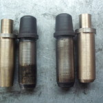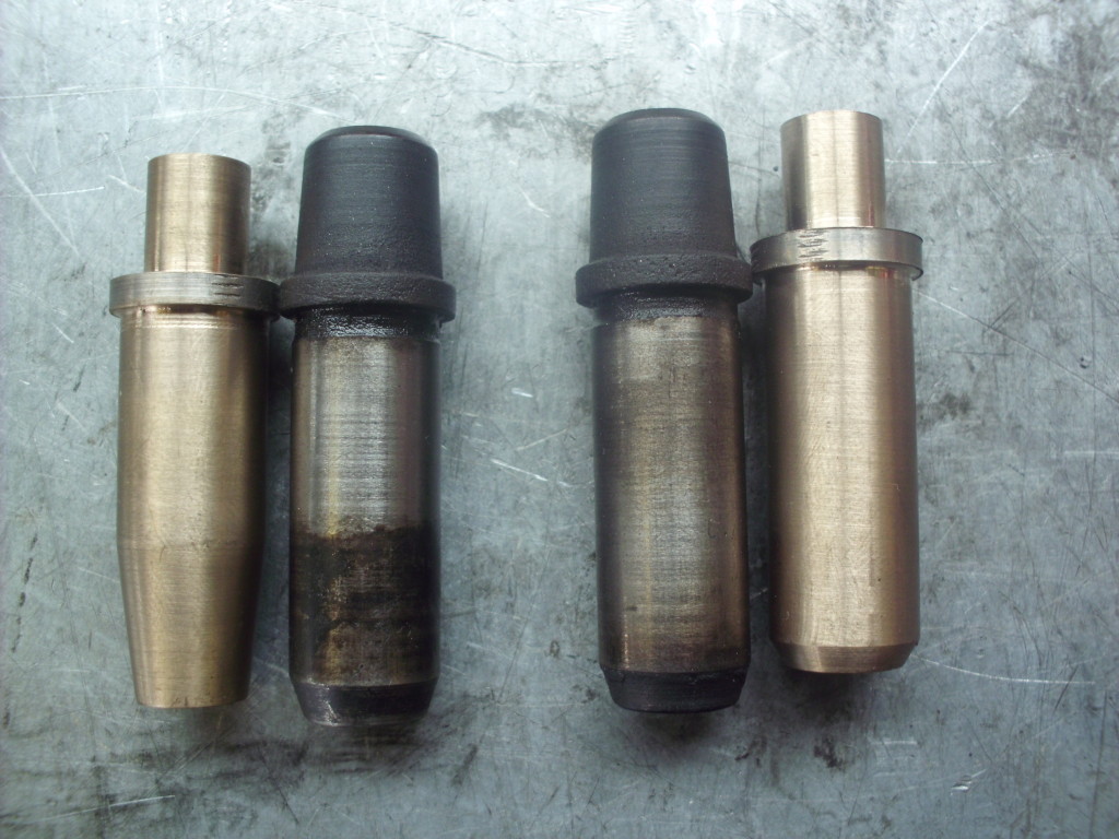 links: kanalseitig stark verwüngte IN-Ventilführung. ganz rechts leicht gekürzte EX-Ventilführng.