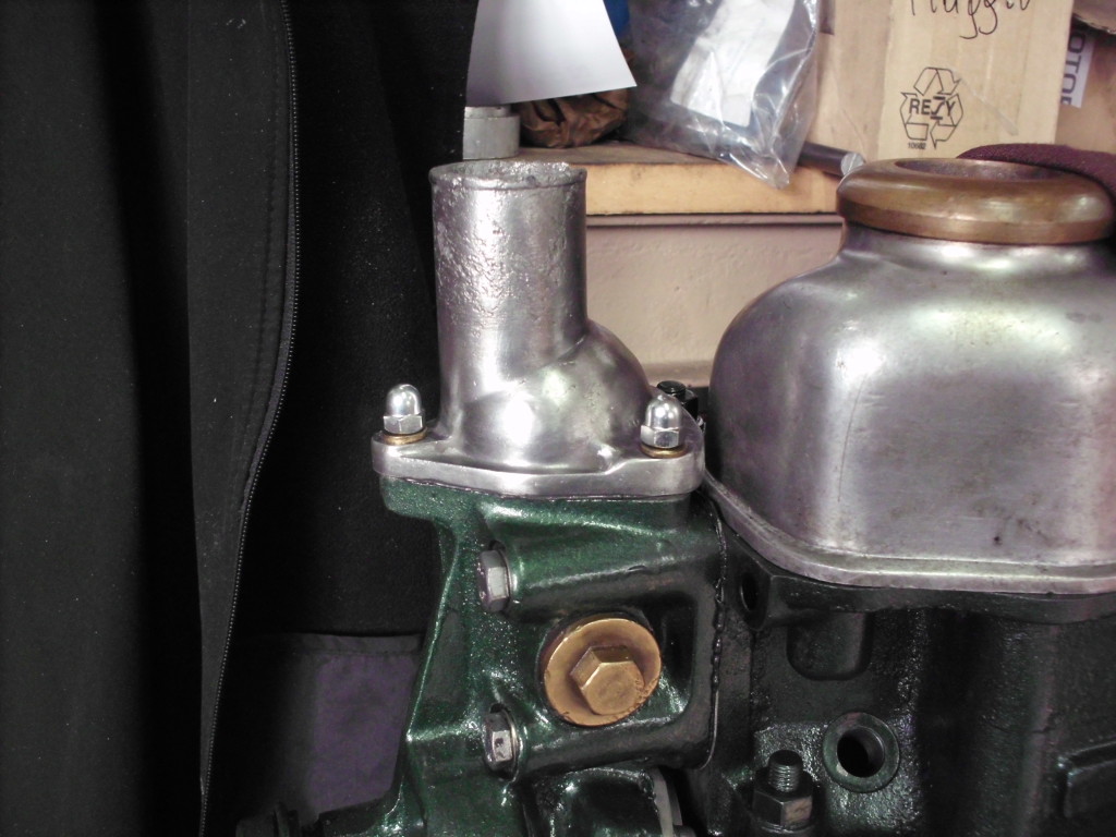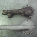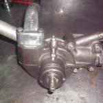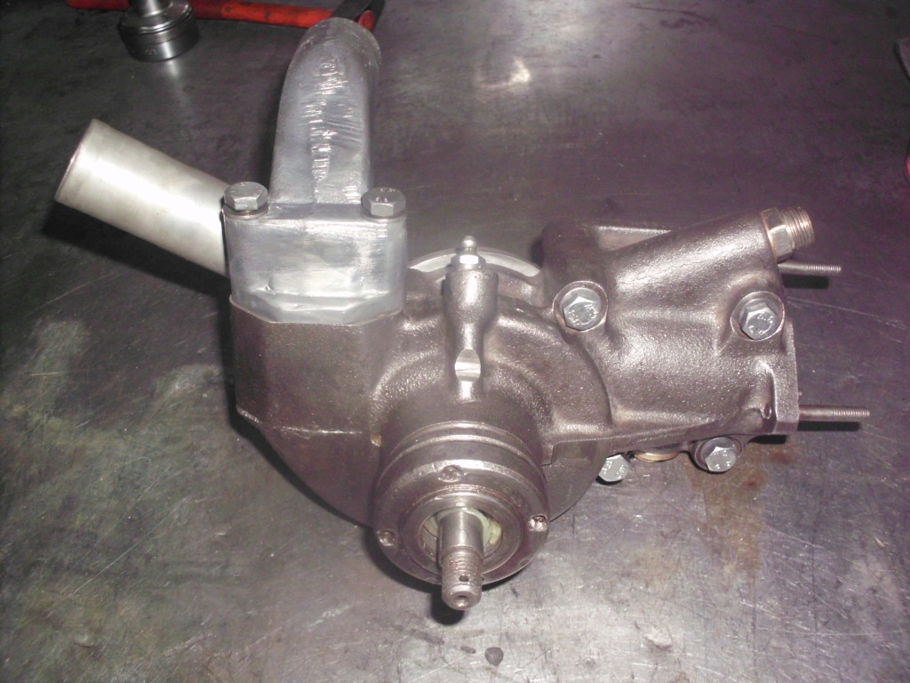 Dieses wichtige Bauteil bereitete uns besondere Kopfschmerzen. Alle Aluminiumteile des Wasserkreislaufs waren bis zum endgültigen Zerfall zerfressen. Die Lagerung war in furchtbarem Zustand. Die Kugellager waren mit dünnem Kupferblech umwickelt um das überhöhte Lagerspiel zu überbrücken. Der Gußkörper war auch durch Korrosion stark angegriffen.